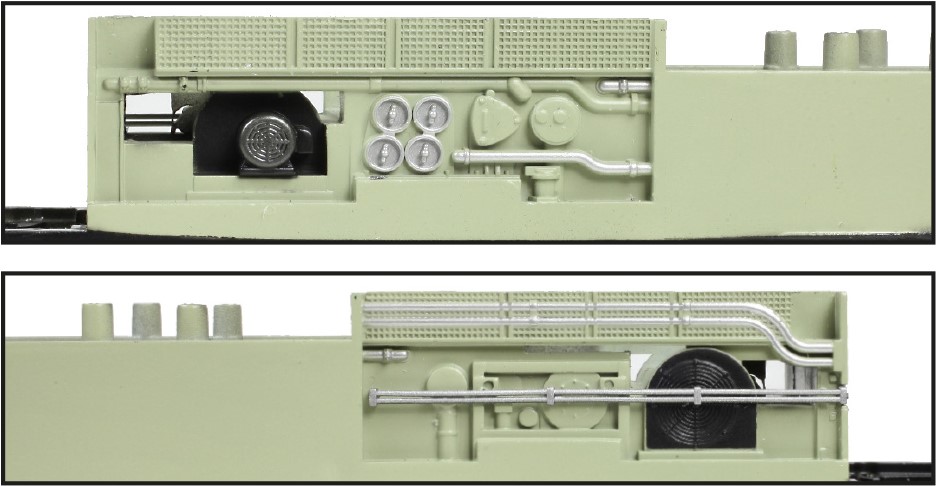 The interiors of the cabs have been decorated with a similarly high level of detail, with the chairs and desks fully painted and warning signs and information panels printed along the walls. The machine room interiors are also fully decorated despite only being visible through the bodyside grilles, with each pipe, cable, dial and fan having been faithfully picked out. The decorations in both rooms are complemented by separately controllable interior lighting when used on DCC.