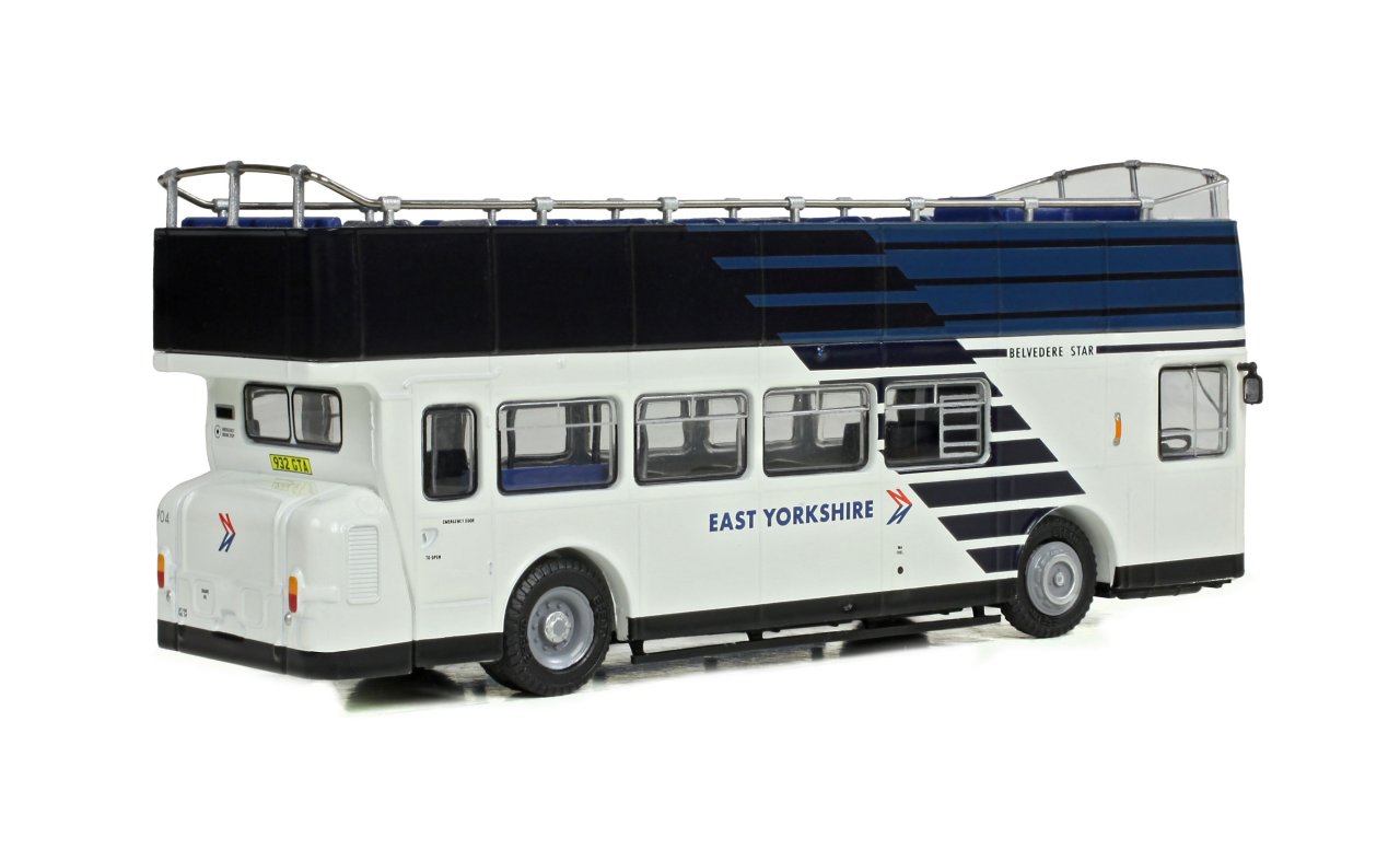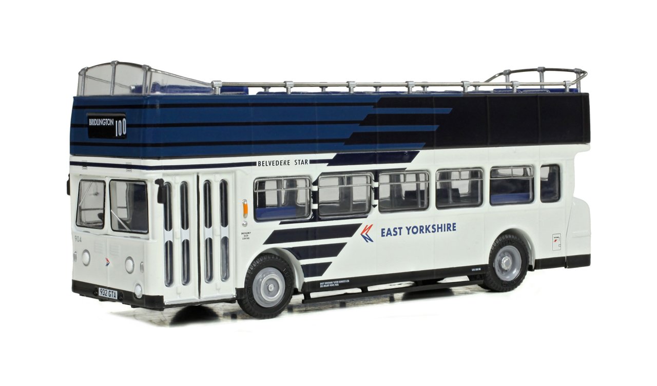 This model is 932GTA (originally ‘Earl Howe’) in its circa 1984 condition as working for East Yorkshire NBC in the Bridlington area. It is finished in NBC’s striking white and blue ‘venetian blind’ livery, complete with East Yorkshire branding, fleet number 904 and the name ‘Belvedere Star’. The front blind carries a service 100 to Bridlington destination, and the later style of replacement rear engine bustle completes the model
