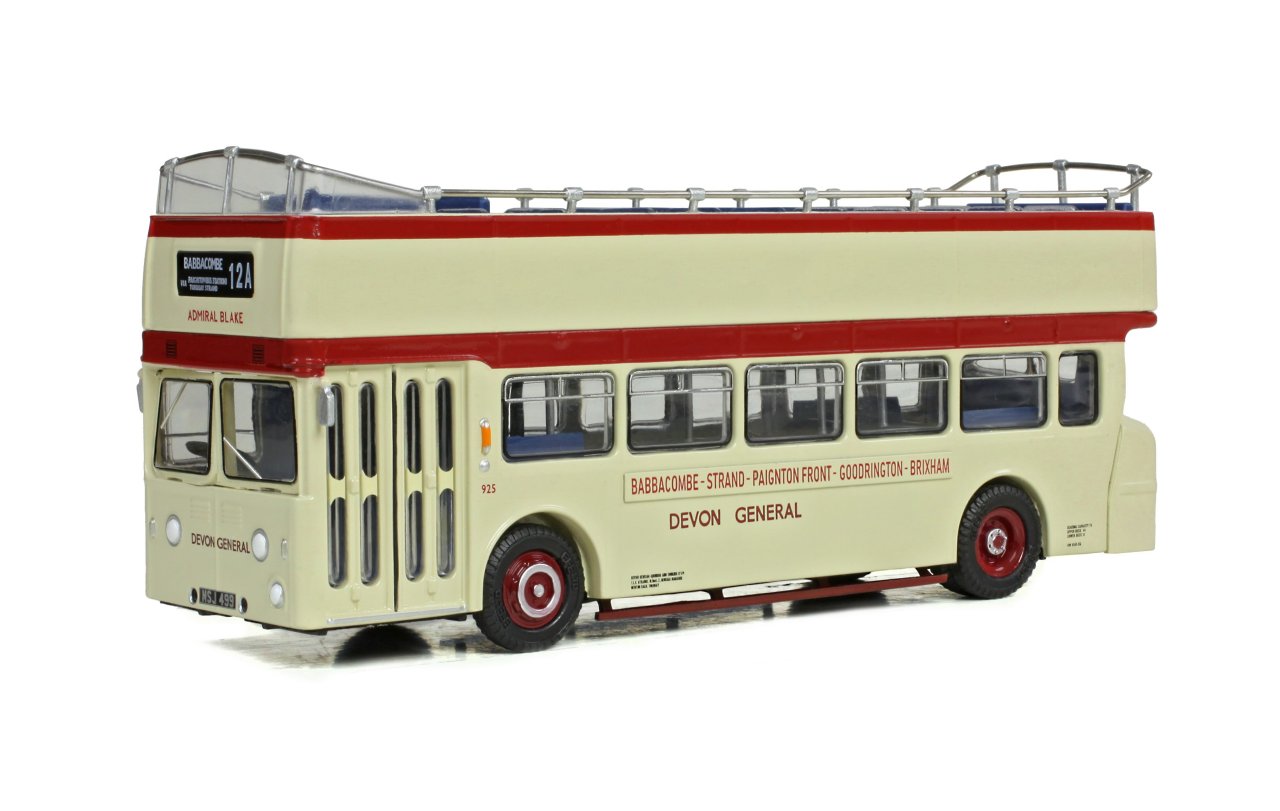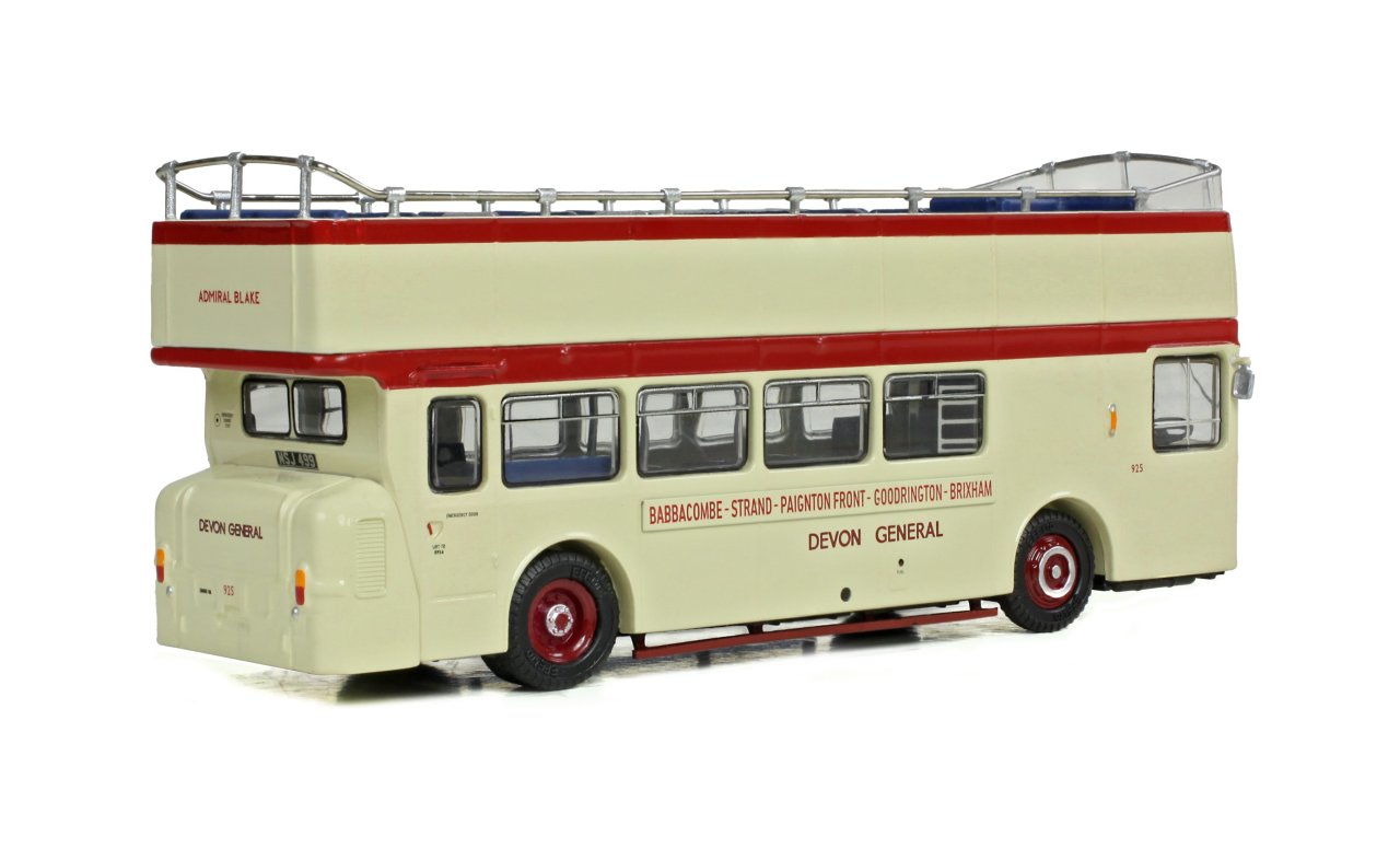This model depicts the preserved registration MSJ499, which was originally 925GTA ‘Admiral Blake’. It is presented in its current condition, as restored in Devon General cream and red as number 925, and proudly displaying its original name. In this guise ‘Admiral Blake’ can still be seen at bus rallies and on hire duties.