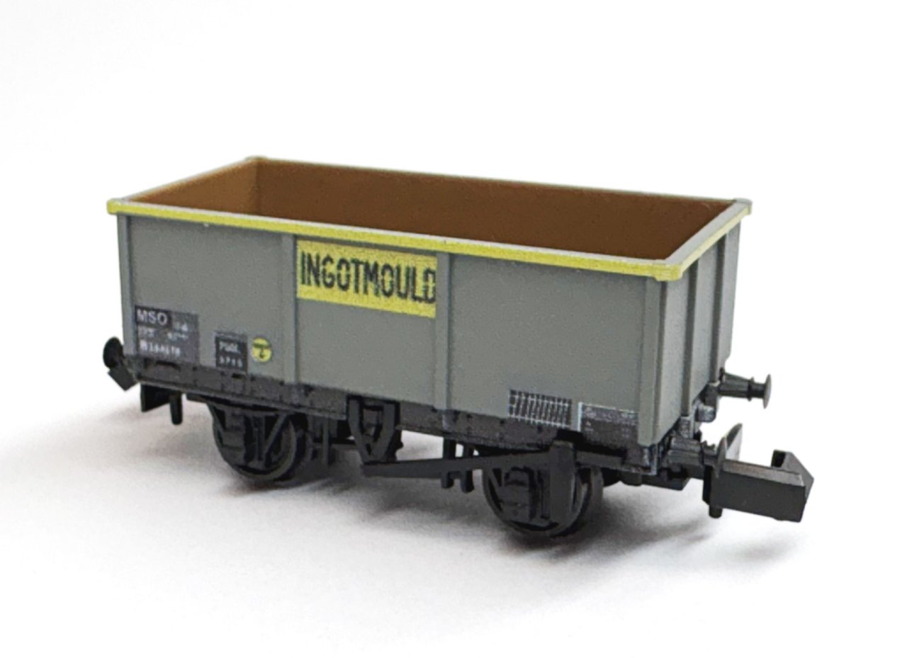 Peco say "From around 1975 a number of 16t mineral wagons were converted to carry heavy castings used in the steel production industry. These castings were placed on a layer of ballast inside the wagon to cushion the load. Our model therefore represents a typical example form the period, the swansong of the 16t mineral, as they were eventually phased out of service completely during the 1980s.