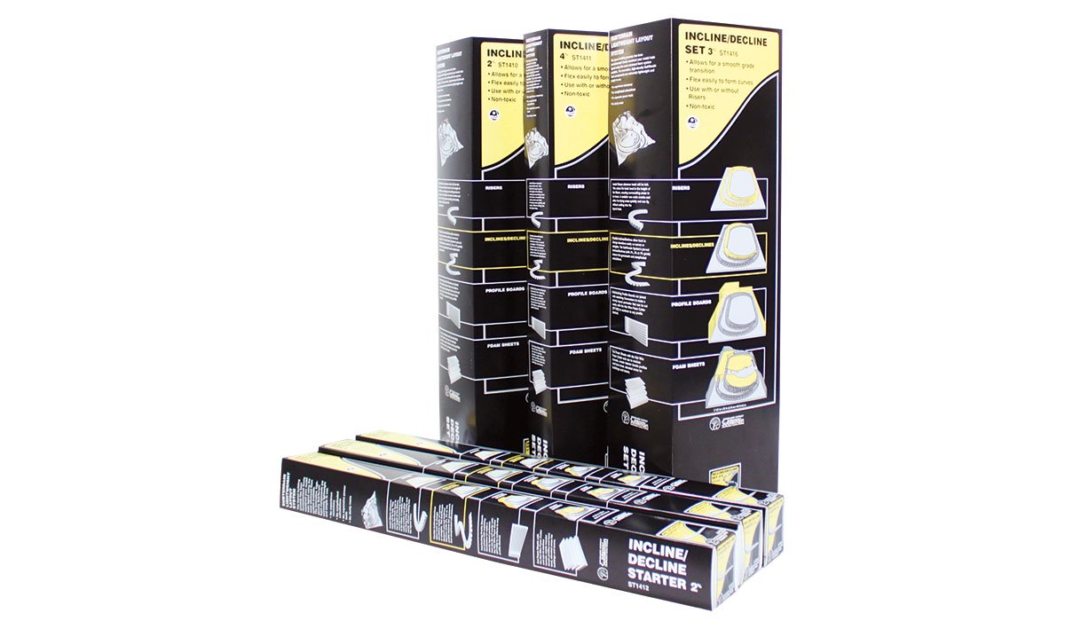 Incline/Decline Sets are the ideal way to alter the elevation of your track quickly and easily. Each set includes the high-density foam pieces necessary to raise or lower the elevation of your track. Incline/Decline Sets come in either 2%, 3% or 4% grades.