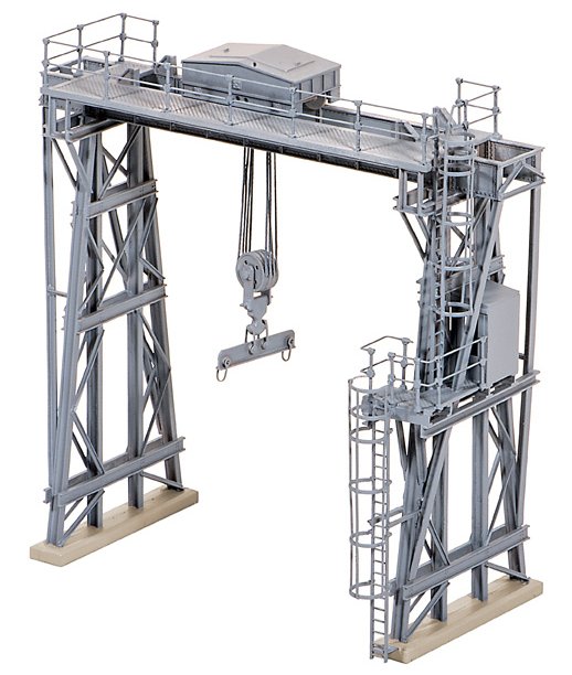 From the late 1960's the spread of shipping containers revolutionised the transport of goods. On the railways marshalling yards gave way to intermodal depots as containers are transferred between ships, trains and road vehicles. The Rolling Underframe kit (Ref 546A) can be added to transform this unit into a movable crane. Supplied with pre-coloured parts although painting and/or weathering can add realism (See the Pecoscene Weathering Powder range PS-360 - 365); glue is required to complete this model. Footprint; Sides 61mm wide X 125mm High, Span 153mm