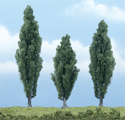 TR1611 Woodland Scenics Premium Tree - Poplar (1 x 4 3/4in, 1 x 3 1/2in, 1 x 4 1/4in). A tall, fast-growing, deciduous tree that is planted side-by-side, primarily for privacy along fencerows.