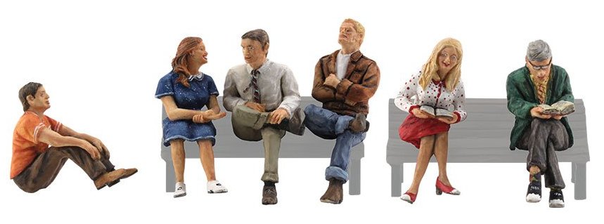 Set includes two women and four men. One man sits on the ground, with his back to a wall. A man and a woman sit reading books. One man and woman seem engaged in friendly conversation, while another man, in a leather jacket sits close by, arms crossed.