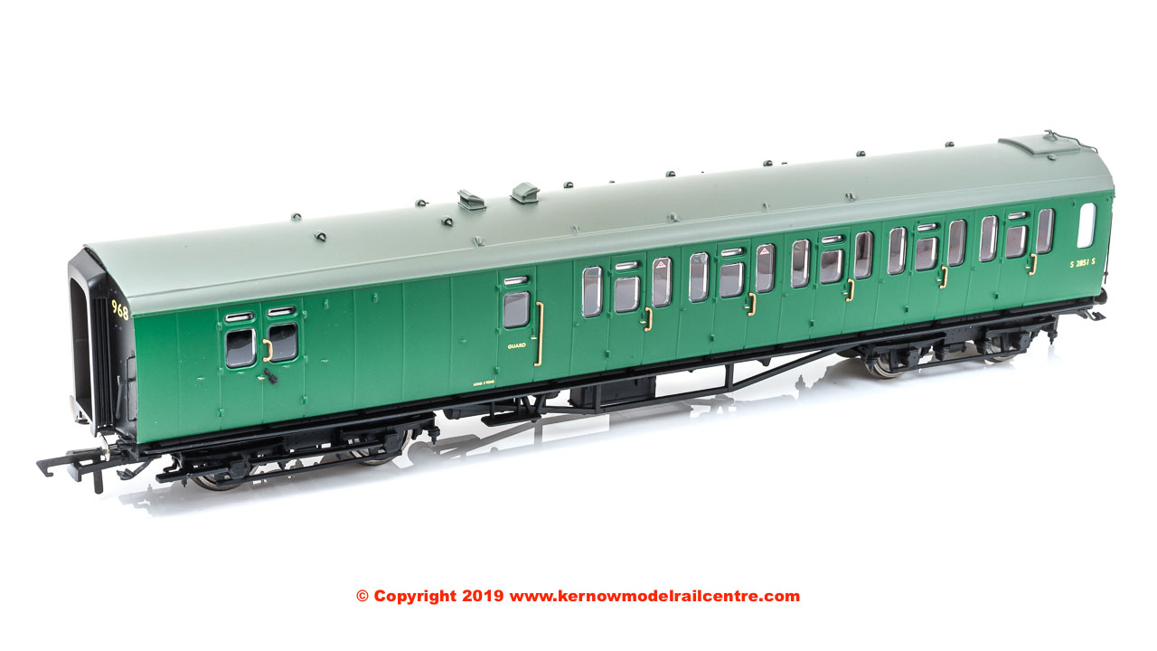 Featuring a smooth, continuously curved bodyside, with small fixed windows above the door windows, the exterior was distinctly Bulleid in character and was a perfect match for his streamlined Pacifics and Light Pacifics. However, the interim nature of the design was apparent in the retention of Maunsell's underframe and layout, with side doors providing access to each compartment. Two types of stock were built; a Composite of four First, and three Third Class compartments to Diag. 2316 and a Brake Third of five compartments, with a 22' long brake van to Diag, 2121.