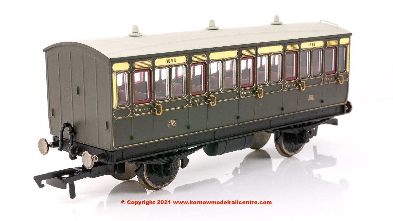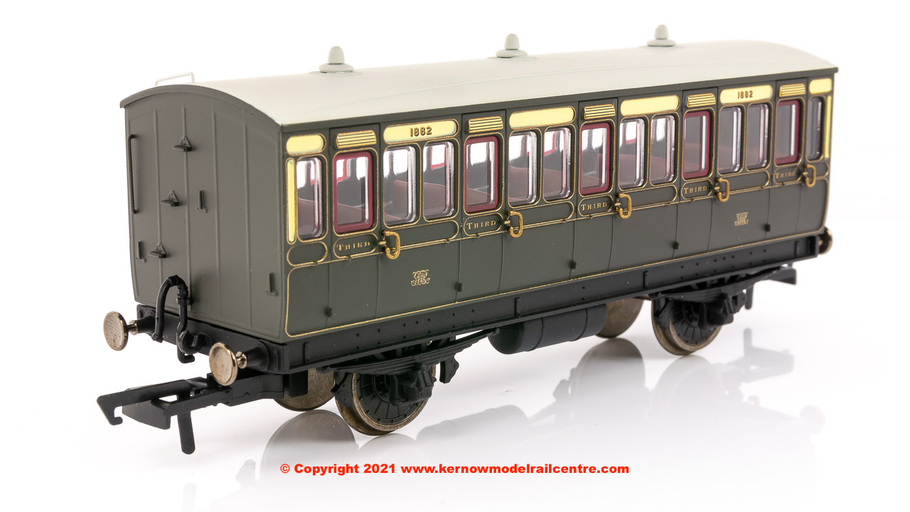 This GWR coach is modelled as having step boards to enable access at stations with low platforms and gas lighting.