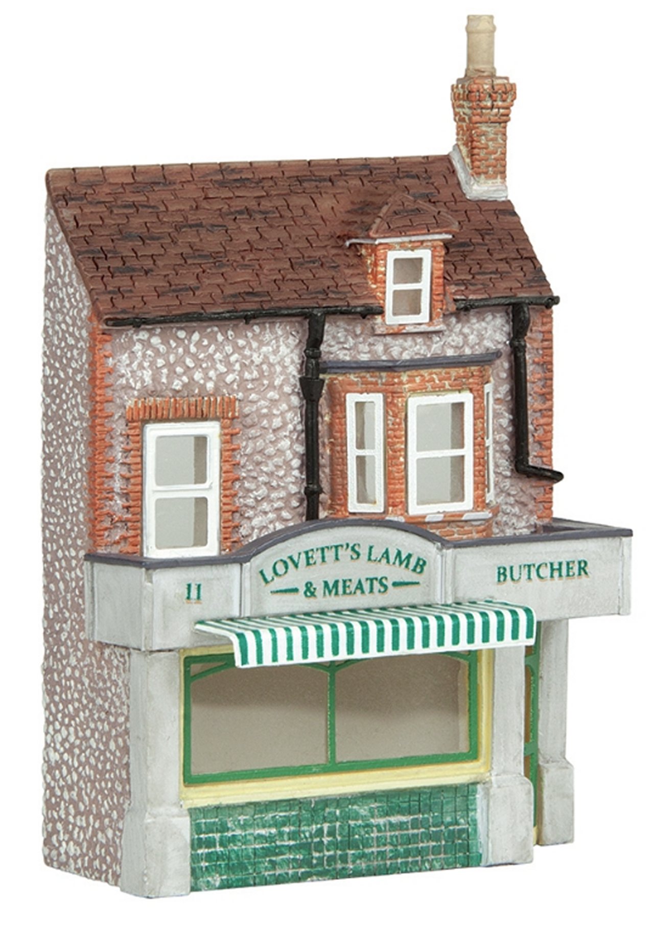 A perfect addition to the wide range of Low Relief shops and houses by Scenecraft, ‘Lovett’s Lamb and Meats’ is inspired by the butcher’s shop in the seaside town of Sheringham, Norfolk and named after former Bachmann stalwart Dennis Lovett. The delightful flint building is finished with a colourful shop front and green & white canopy, making an attractive addition to any Low Relief scene.