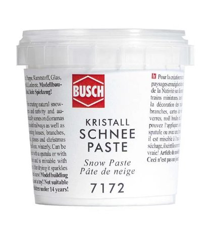 For the authentic design of natural snow landscapes in diorama construction and on model railways, cribs, houses, branches, greeting cards, glasses, Christmas tree balls, etc. Sparkles like true snow after drying! Can be applied with a spatula or brush (if necessary, incorporate into the still soft mass traces of vehicles, animals, etc.). Dilutable with water. After a drying time of 2 - 3 hours, the snow surface is firm, but still elastic. Adheres to wood, cardboard, plastic, glass, metal, leather etc.