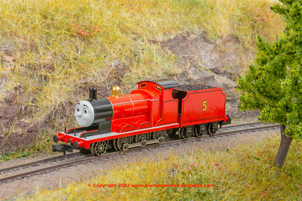 James is the No. 5 red engine. He is a medium-sized engine whose six driving wheels are not as big as Gordon's but not as small as Thomas'. He has a fine scarlet coat and brass dome and thinks of himself as a Really Splendid Engine. Occasionally this leads to misguided ideas about the sort of work suitable for such a distinguished engine, invariably landing James in trouble. James is a mixed-traffic engine, which means he can pull both passenger coaches and freight cars. James is based on a Hughes Class 28 superheated 2-6-0 tender engine. Bachmann carefully reproduces your favorite Thomas & Friends™ characters in N scale.  All locomotives feature realistic faces, operating N scale electric drive mechanisms,  highly detailed plastic body shells, and all-metal wheels.