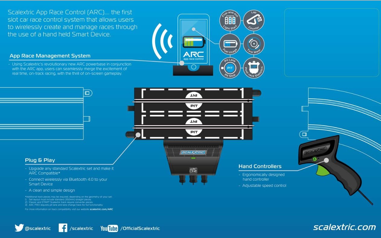 Contains 1x Smart device cradle, 1x ARC AIR powerbase and pit box straight, 2x wireless controllers and 1x transformer
