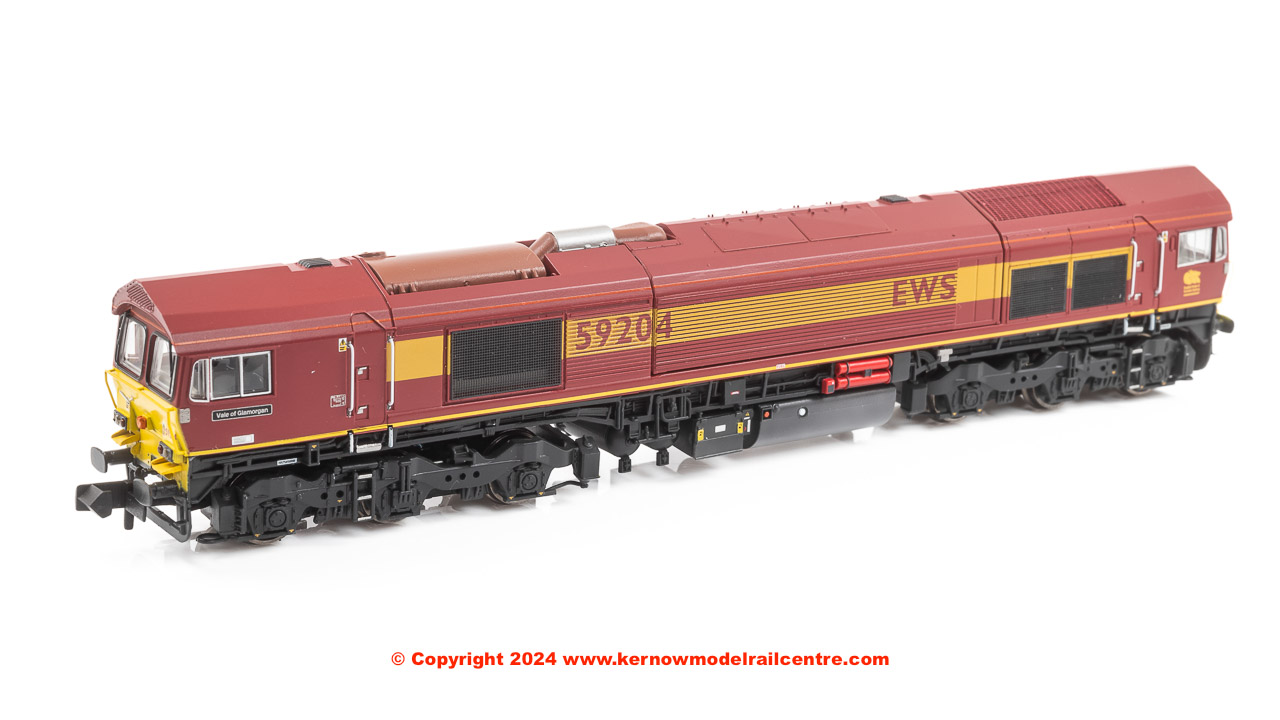 Version details for EWS 59/2s: revised handrails and door handles; revised lashing loops on the solebars; drop head knuckle couplers; change to the cooling pipes and fire extinguisher arrangements (bright red extinguisher bottles as part of the solebar)