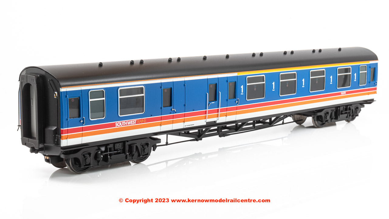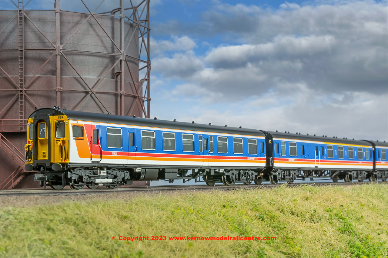 Each of the three vehicles that make up this 3-car set is adorned with fine detail from the door handles, hinges and bumpers to the window frames picked out so neatly in silver. Metal wire handrails are fitted at each end of the two DMSO vehicles, and the multiple working equipment, windscreen wipers and roof mounted horns are all fitted separately. Metal handrails also feature aside the guard’s door and metal toilet filler pipes can be found at each end of the TBCK vehicle. Underneath each vehicle the truss frames and brake gear is depicted, along with a full set of auxiliary equipment and boxes. AT the driving end of each DMSO Mark 4 Motor Bogies can be found, fitted with their third-rail pickup shoes, whilst throughout the rest of the train Commonwealth Bogies are fitted. Through the tinted windows the tables, chairs and compartments are all the more visible thanks to the interior lighting, whilst the cab is fitted with driver’s seat, control desk and brake wheel.