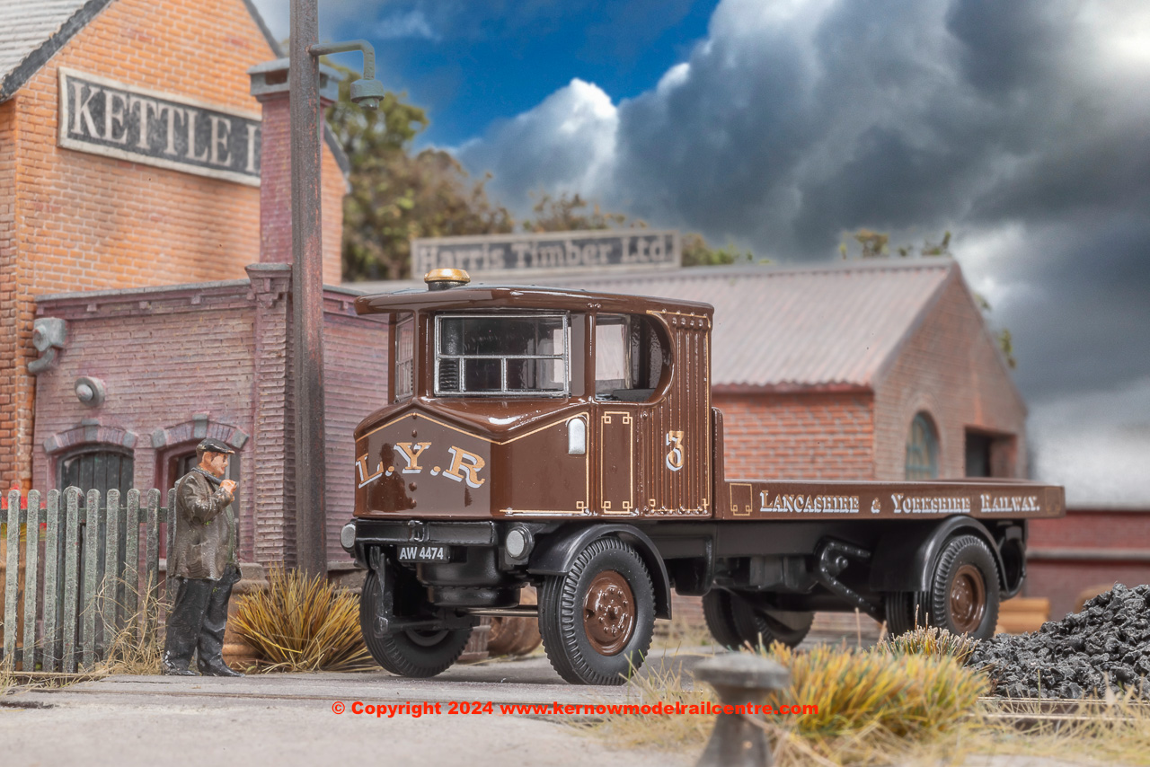 The detail sees the dark brown body with matt black cab roof. The mudguards, chassis and chimney are also black with a gold ring detail added to the top of the chimney. The wheels echo the dark brown body colour and the lettering of the LYR is finished in gold. External trim in silver includes the window surrounds and our model features window glass as well. The flatbed interior is dark brown, all ready to house any 1:76 scale loads you might like to place there, bringing an authentic feel to a model that would look good in any railway yard of the period. Our Sentinel is registered AW 4474.
