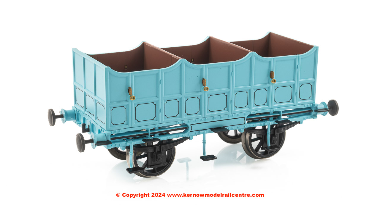 An intricately detailed third class coach model in a blue finish. The accessory bag contains two chain couplings.