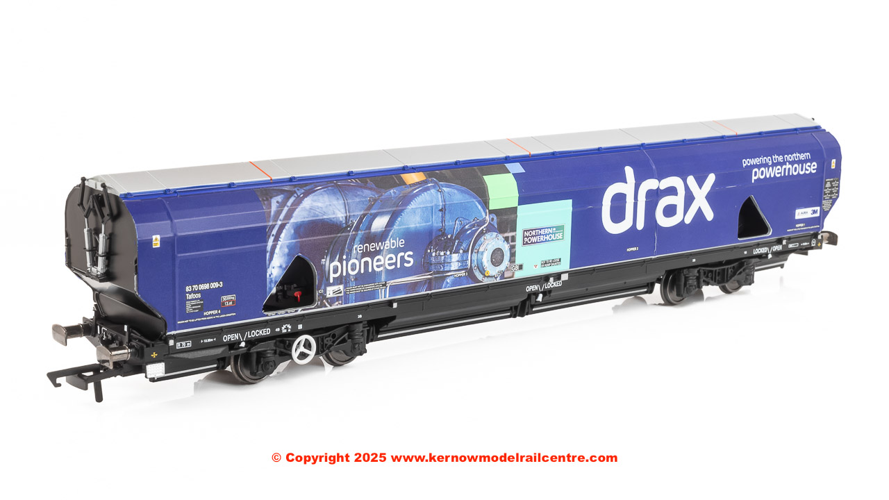 The Drax biomass wagon pack consists of two bright blue Drax Northern Powerhouse liveried wagons with their respective running numbers, 83700698071-3 and 83700698009-3. R60177A contains two biomass wagons with different decals as decoration on the livery compared to this pack.