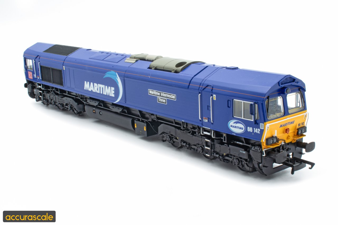 Once an anonymous EWS maroon and gold class 66, 66142 led the life of a typical EWS 66 from its delivery during August 1999 right through the acquisition by DB up until its turn in the paintshop came in 2019 at the ripe age of 20 years old! Rather than the bright red of DB, 66142 gained the vibrant blue colour of Maritime Intermodal and was named "Maritime Intermodal Three". Following Accurascale handing out free 'a' stickers at Warley in 2022, a number of these have found their way in to a wide variety of places, including on real rolling stock. 66142 is one such locomotive and proudly wears its 'a' sticker under one set of numbers