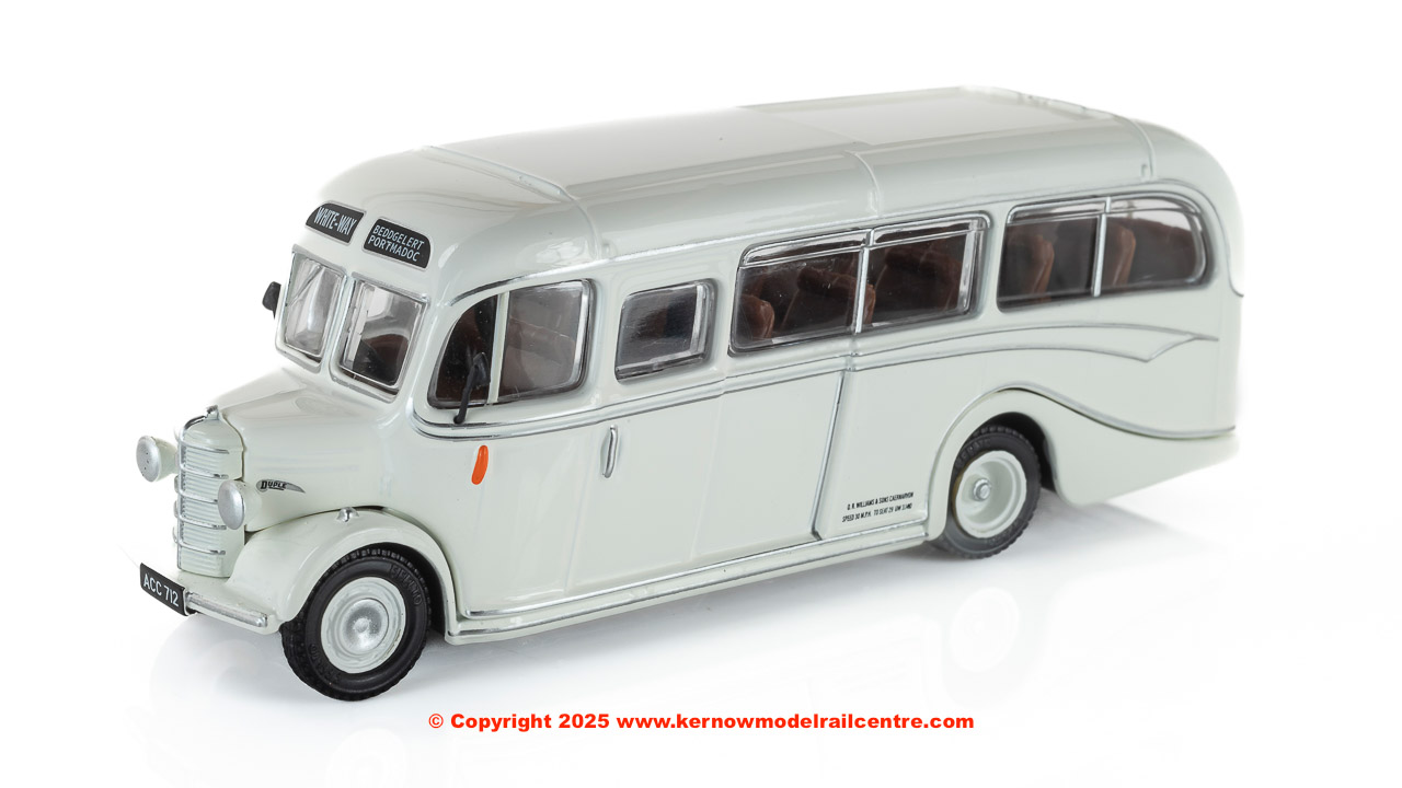 Our model depicts registration ACC712, which went new Whiteway of Waenfawr, near Caernarfon, in 1949; one of seven OBs to be operated by the firm owned by O R Williams. In its plain white livery, it remained a familiar sight on the North Wales roads until the mid-1970s. Our model features a Beddgelert and Porthmadog destination blind as typically carried by the Whiteway OBs.