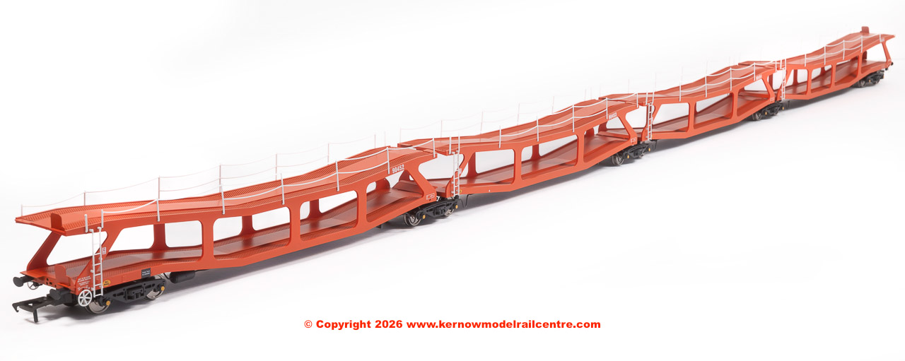 Revolution Trains say "The iconic 4-car articulated Cartic-4 car carriers were built between 1966 and 1972 and lasted until the mid-2000s. The Cartic-4 car carriers were developed jointly by BR and Ford and adopted a radical design at the time for freight stock – comprising a permanently coupled four-part vehicle in which the inner cars were linked via shared bogies on articulated joints. The majority were built for private vehicle transporters MAT, Silcock & Collings and Tolemans, however some were also built by BR and used to launch its Motorail brand in 1966. This offered motorists the opportunity to take their car on holiday with them, with an extensive network of services between cities including London, Birmingham and Sheffield and Scotland, the South West and North Wales. Once Motorail stopped the Cartic-4s were used to transport cars around the country both in block flows from factories to delivery points and in Speedlink flows to dealers.
