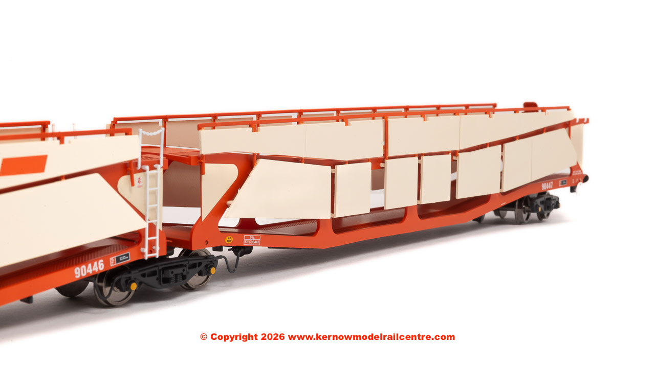 Revolution Trains say "The iconic 4-car articulated Cartic-4 car carriers were built between 1966 and 1972 and lasted until the mid-2000s. The Cartic-4 car carriers were developed jointly by BR and Ford and adopted a radical design at the time for freight stock – comprising a permanently coupled four-part vehicle in which the inner cars were linked via shared bogies on articulated joints. The majority were built for private vehicle transporters MAT, Silcock & Collings and Tolemans, however some were also built by BR and used to launch its Motorail brand in 1966. This offered motorists the opportunity to take their car on holiday with them, with an extensive network of services between cities including London, Birmingham and Sheffield and Scotland, the South West and North Wales. Once Motorail stopped the Cartic-4s were used to transport cars around the country both in block flows from factories to delivery points and in Speedlink flows to dealers.