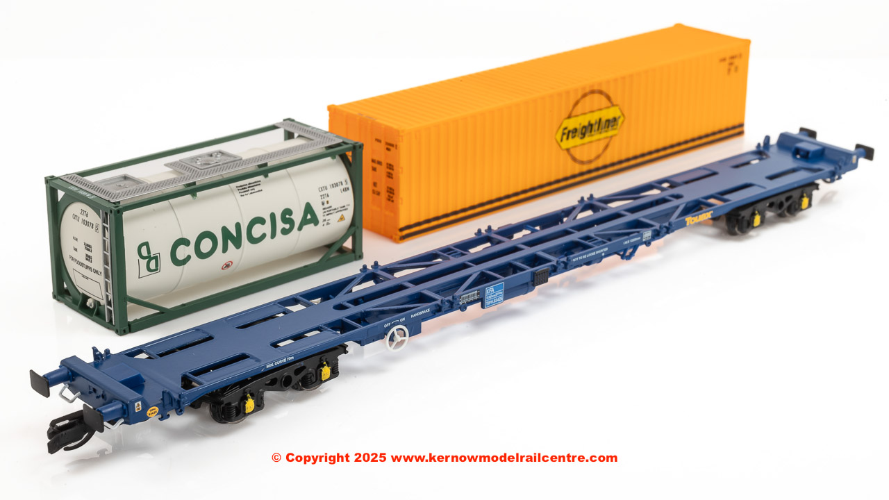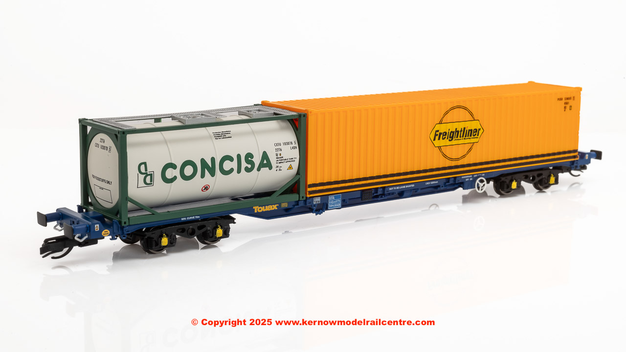This version of the Touax container wagon exploits the KFA’s flexibility in having one 40ft-long container in the livery of Freightliner, and one 20ft tank container in the white livery of Spanish shipping company Concisa.