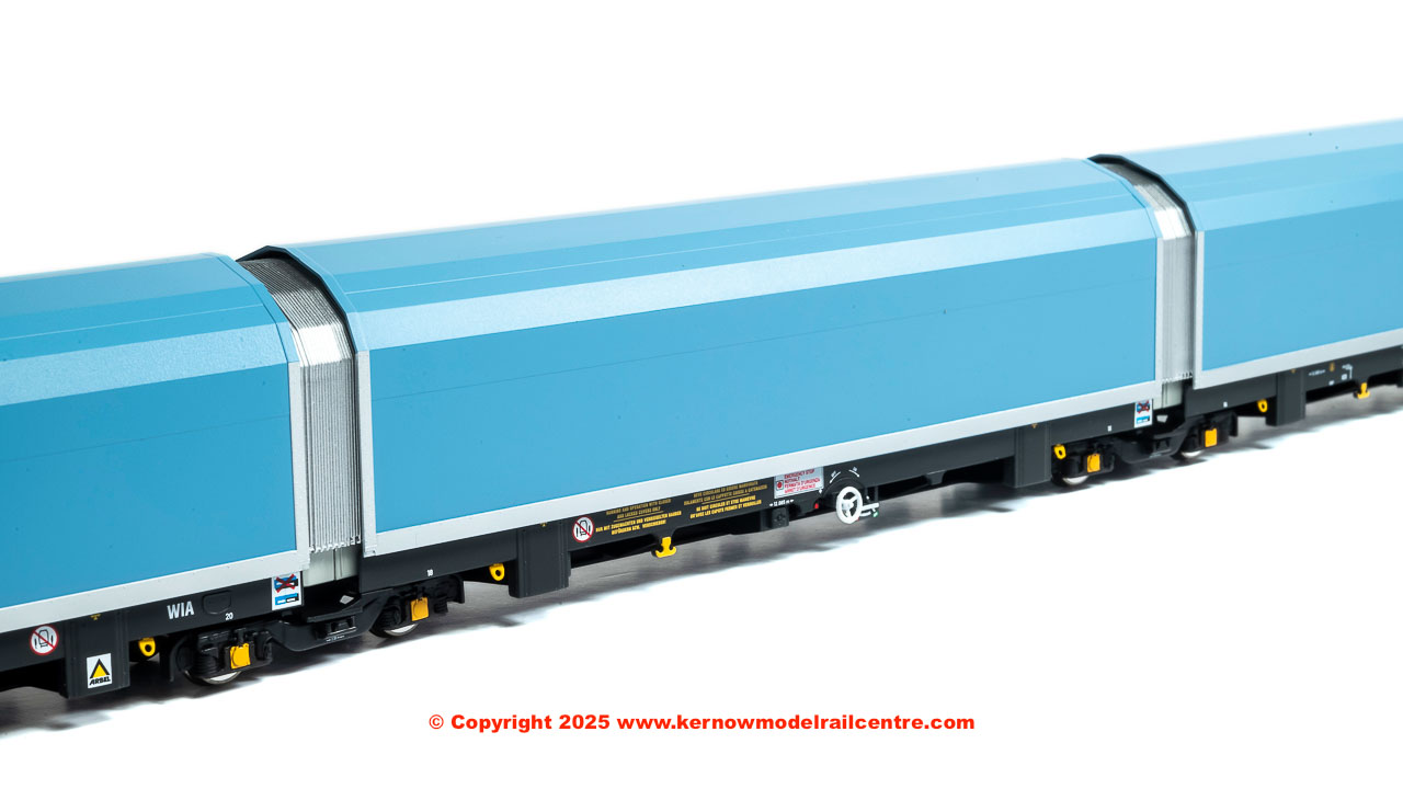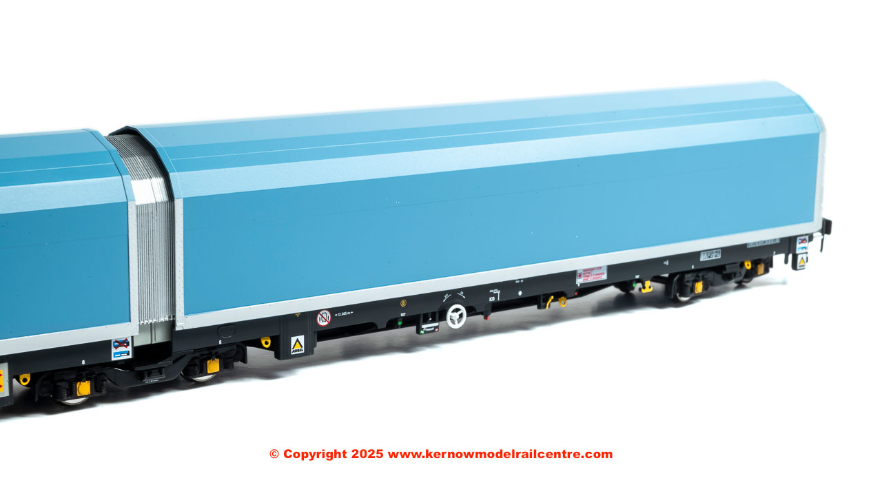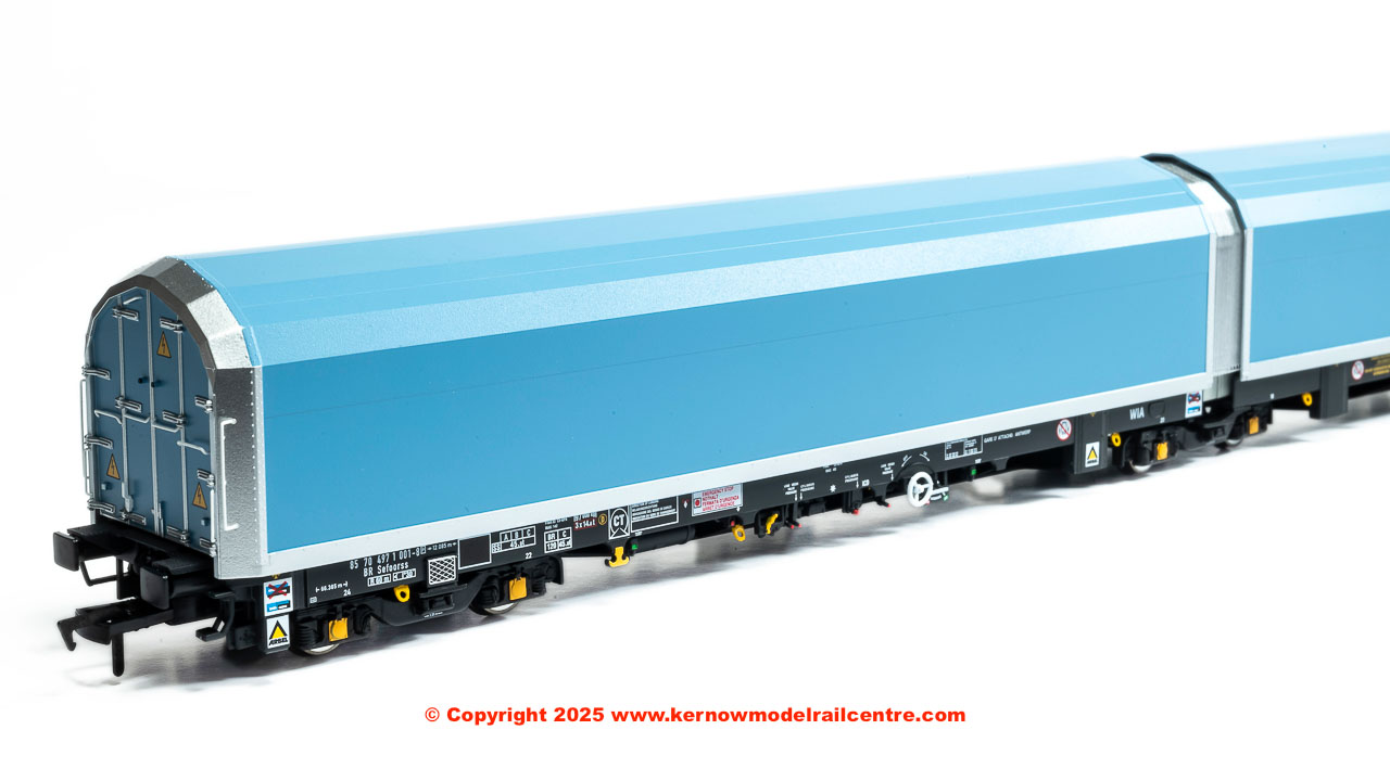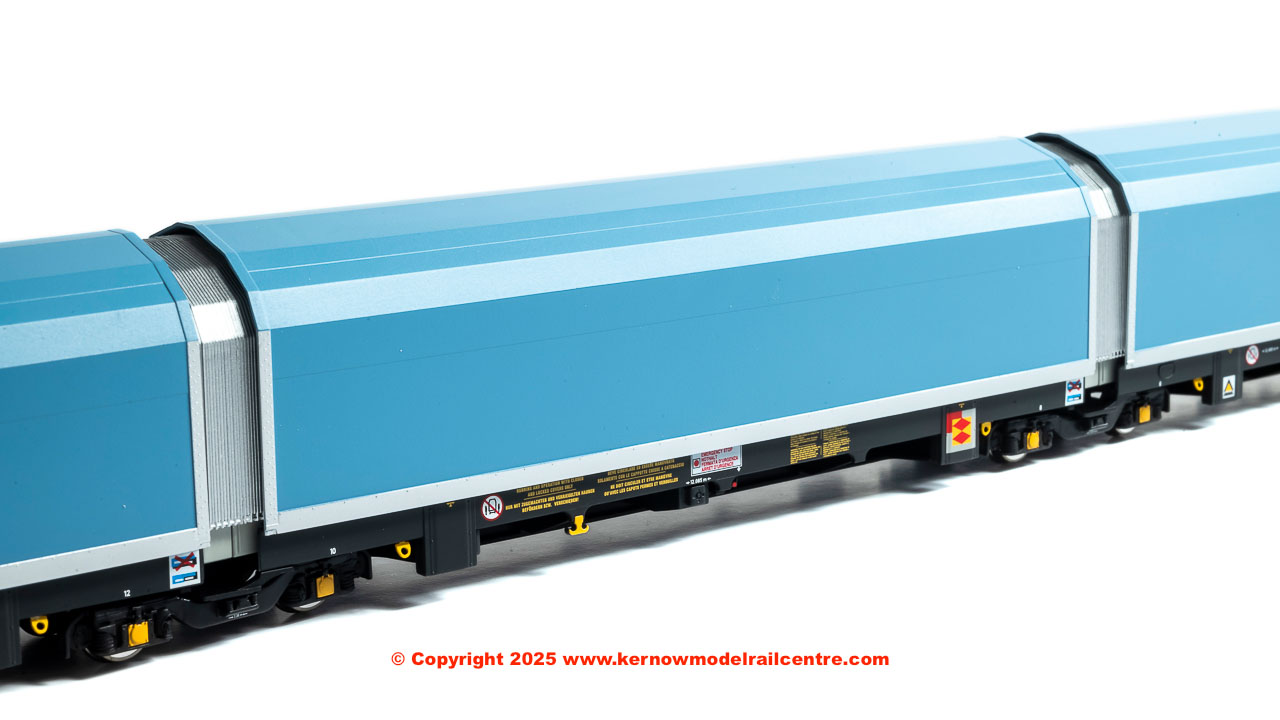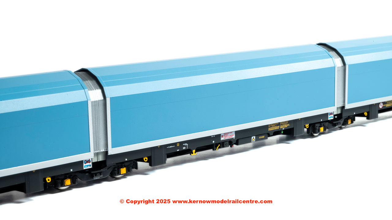 • pack of 5 articulated wagons (each individually numbered and with prototypical livery variations) in pale blue livery with a variety of brandings