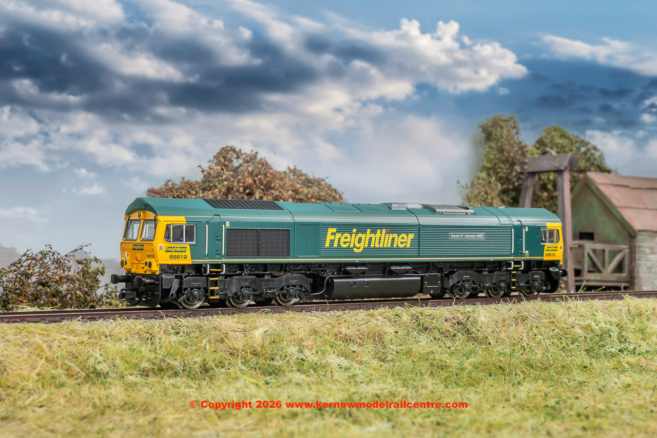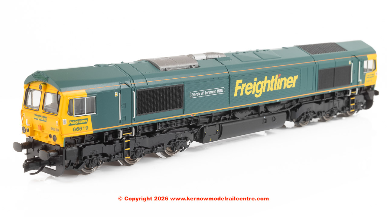 Celebrate the legacy of modern freight operations with the Hornby TT:120 Freightliner Class 66 Co-Co 66619 ‘Derek W. Johnson MBE’. This meticulously detailed model honours locomotive 66619, which was named in February 2006 after Derek W. Johnson MBE. Finished in the distinctive Freightliner green and yellow livery and equipped with a DCC Ready 18-pin socket, this locomotive is prepared for easy digital conversion. Its 5-pole skew wound motor ensures smooth and reliable performance, while directional and interior lighting, including working headlamps, enhances realism on your layout. Designed with diligence, this model features metal buffers and NEM couplings, ensuring accuracy and compatibility. Whether running intermodal, aggregate, or fuel trains, these locomotives can be paired with an impressive selection of rolling stock to enhance your layout including IFA, KFA & MGR wagons. TTA wagons, frequently used for fuel transport, also compliment the Class 66 allowing a realistic and visually striking freight formation.