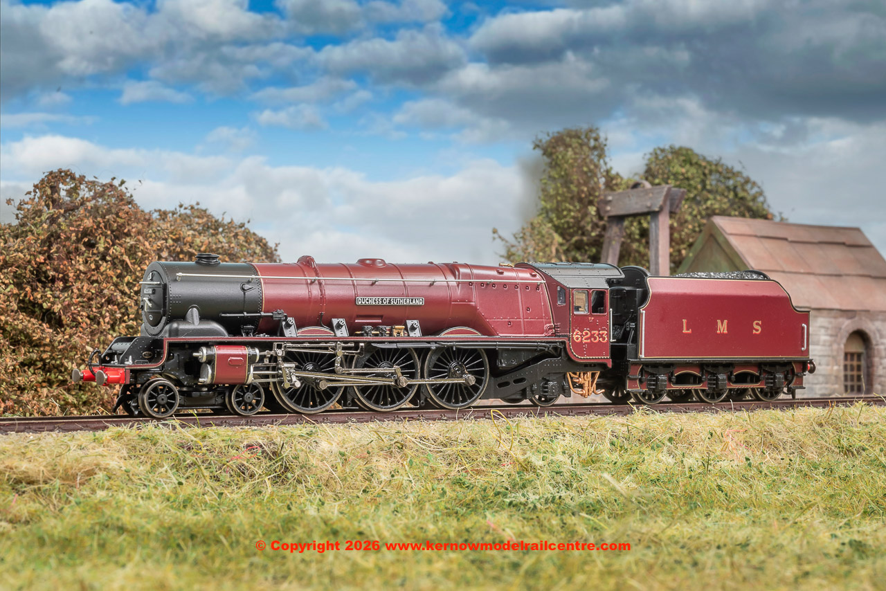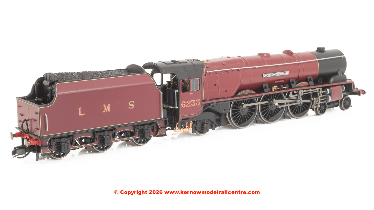 The ‘Princess Coronations’, also known as ‘Duchesses’, were the ultimate LMS express locomotives, built to the design of William Stanier, 38 of which entered service; the first in June 1937, the last not until May 1948 under the auspices of British Railways. Twenty-four of the class carried streamlining, which was removed from 1946 onward, but 6233 wasn’t one of them, having been built in conventional form and entering service in July 1938. It was fitted with a double chimney in 1941 and in 1946 received smoke deflectors, becoming BR 46233 in 1948 and withdrawn in February 1964. It is preserved at the Midland Railway-Butterley and has been a regular operator on the main line. The model depicts ‘Duchess of Sutherland’ in as-built condition, prior to being fitted with a double-chimney in 1941.