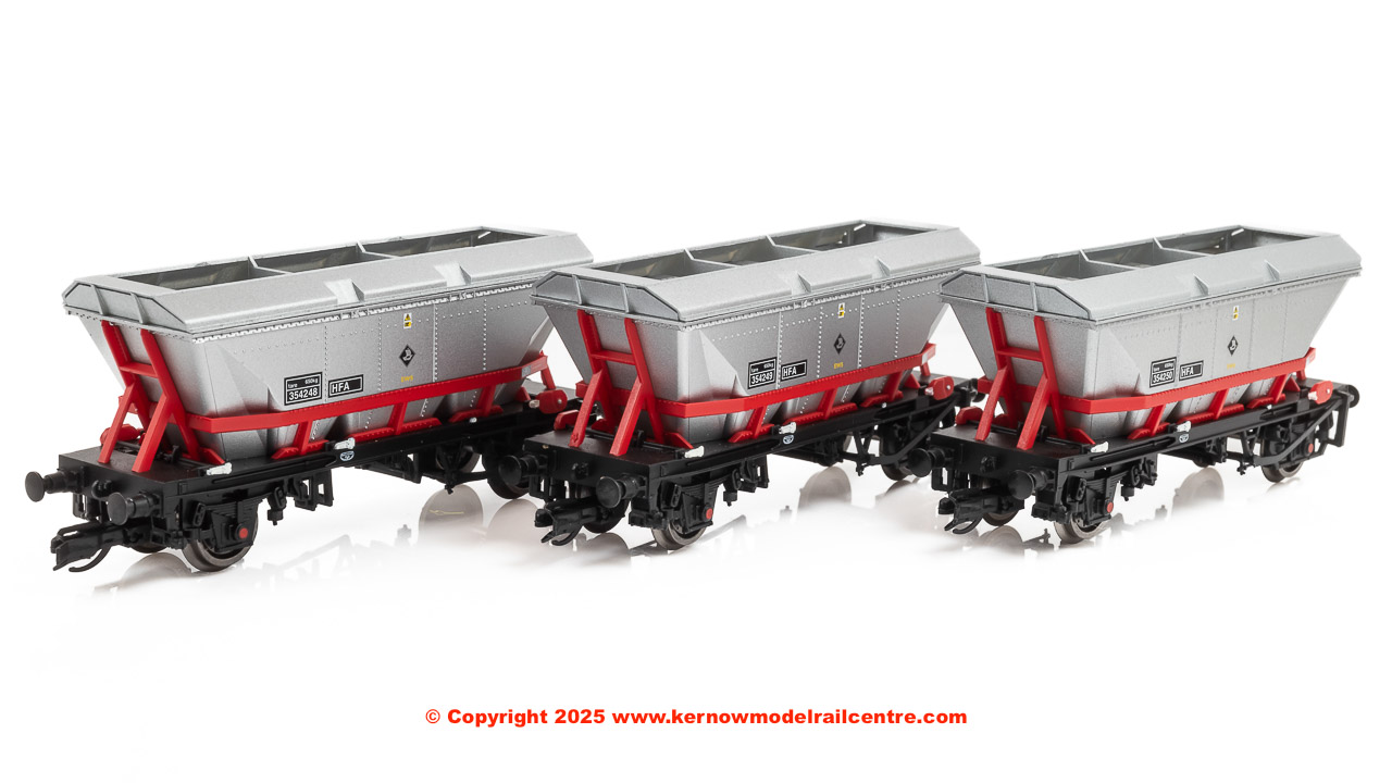These wagons were supplied with an aerodynamic canopy and could operate at 45mph when loaded. The wagons in the triple-pack each have different running numbers.