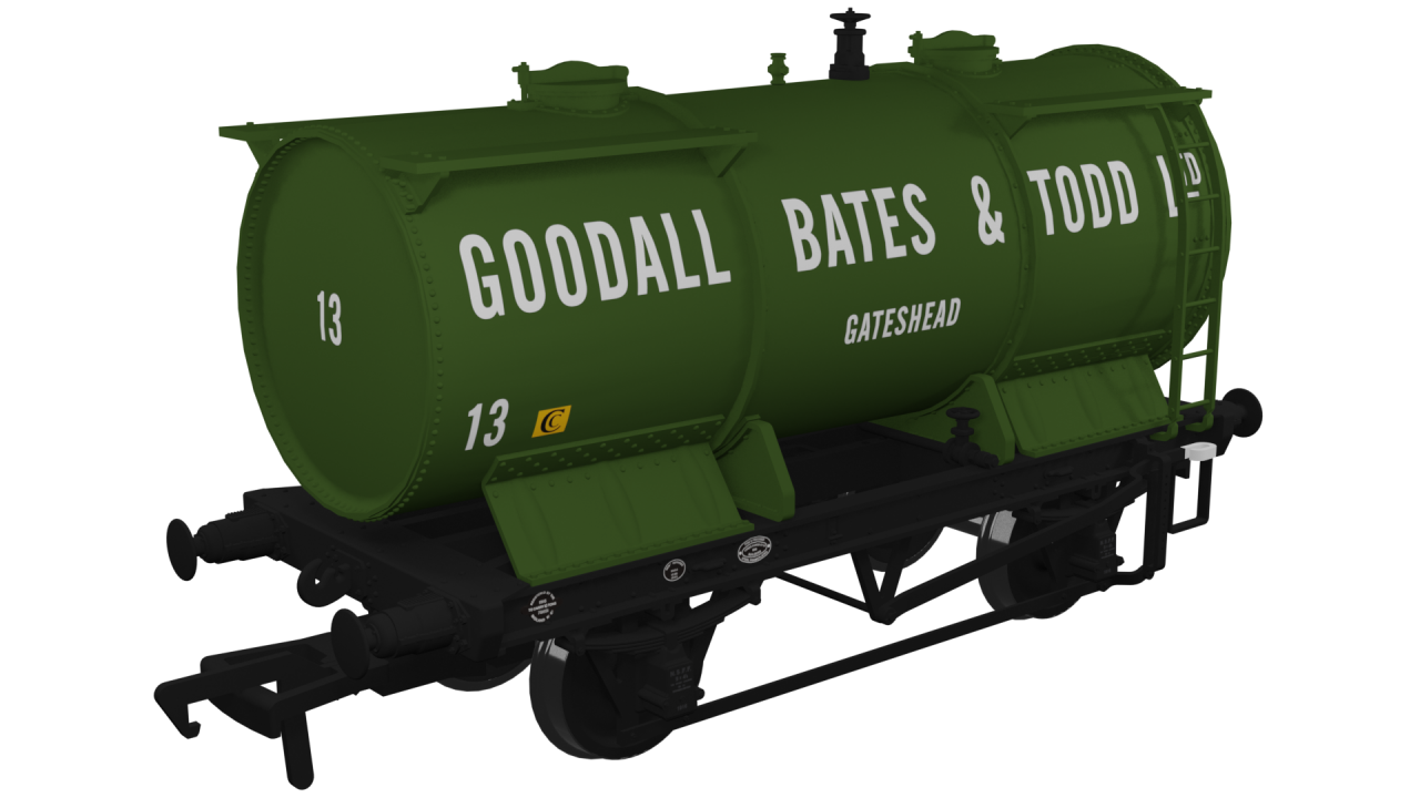 Rapido say "The Ministry of Munitions ordered a fleet of 100 10-ton tank wagons from The Leeds Forge Company in 1916. Ammonium nitrate is a tricky chemical to transport because it is a crystalline substance which absorbs water vapour and then sets hard like concrete, so there is potential for the load to set hard during transportation. To counter this problem, the wagon's design featured an airtight tank to prevent water ingress. This door resembled a conventional dished tank barrel end and was designed to open like a smokebox door; however, it was hinged at the top. The wagons were loaded through the two manholes on the top of the barrel and were emptied by releasing the end door and lifting them at the fixed end of the wagon to tip out the contents, this was further aided by the conical shape of the barrels. These were highly unusual wagons, as they appeared to be similar to their conventional liquid tank wagon counterparts but instead carried powder. They also featured underframes made from pressed steel components, which was a speciality of The Leeds Forge Company. At the end of WW1, these wagons immediately became War Surplus and were disposed of as there was no need for any wagons to transport ammonium nitrate; they were subsequently converted into liquid-carrying tank wagons. This was done by securing the end door and fitting discharge facilities. As almost brand-new wagons, they quickly found homes with several private companies. With these gradually changing hands over the years, they would appear across the country in an eclectic mix of guises."