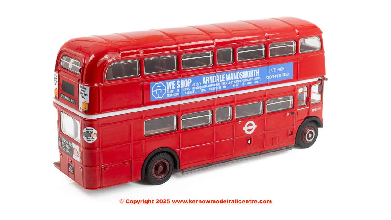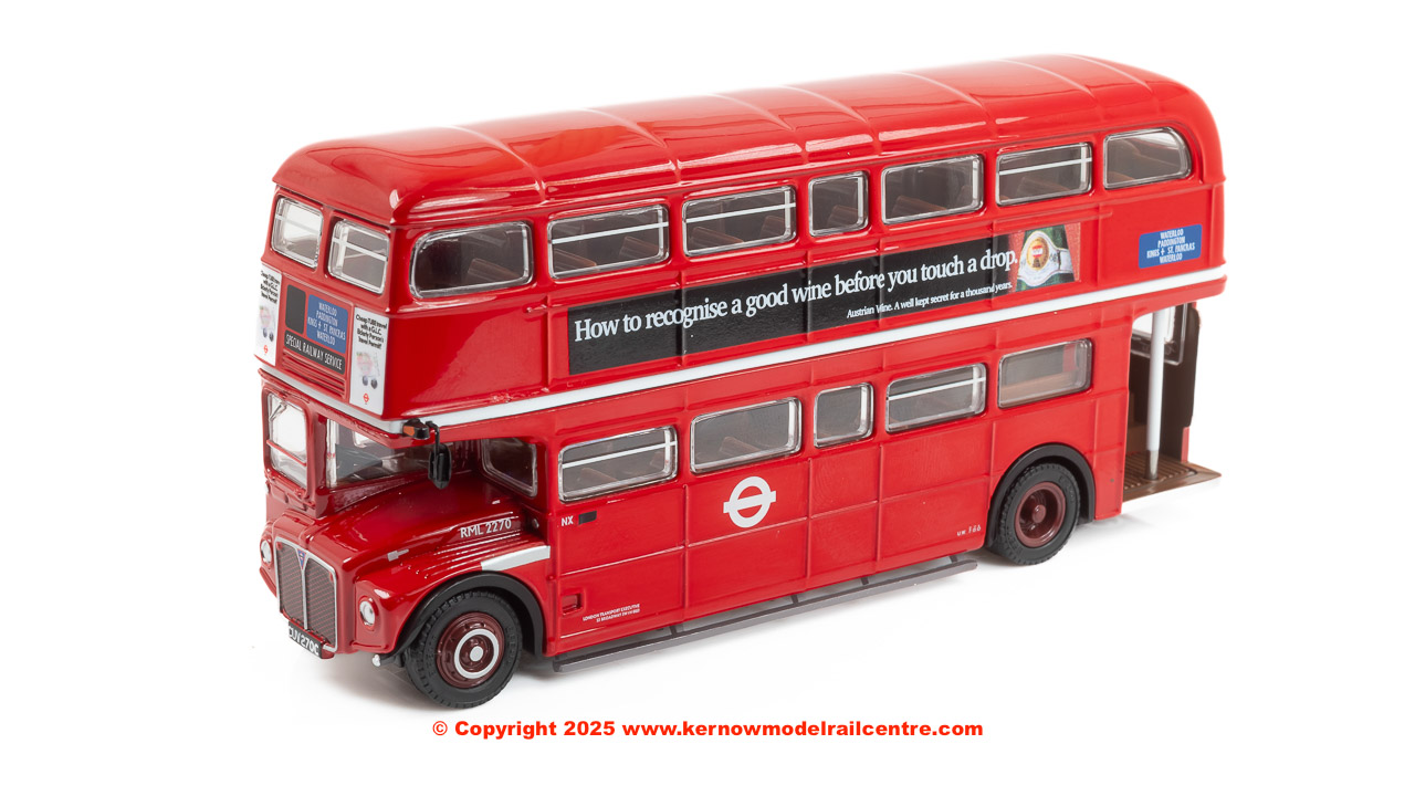 Our model depicts RML2270 (CUV270C), which originally entered London Transport service in November 1965. It is presented in its 1978 condition as allocated to New Cross garage, with solid LT roundels, and working a Special Railway Service linking Waterloo with Paddington, King’s Cross and St Pancras".