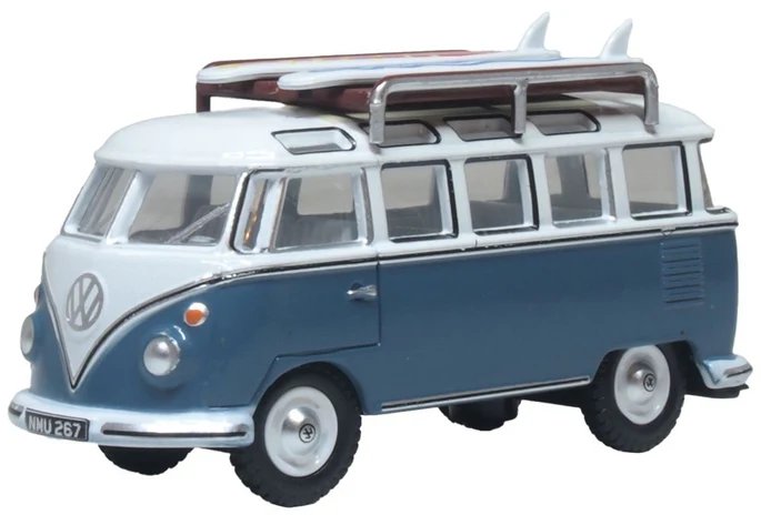 Here we see Oxford’s 1:76 scale top of the range VW T1 Samba bus model sporting a silver roof rack, complete with two brightly coloured surfboards. The body is decorated in bright blue and white and with white bumpers and wheels. The interior is also white with a tan dashboard. Registered NMU 267, this one definitely belongs on the beach!
