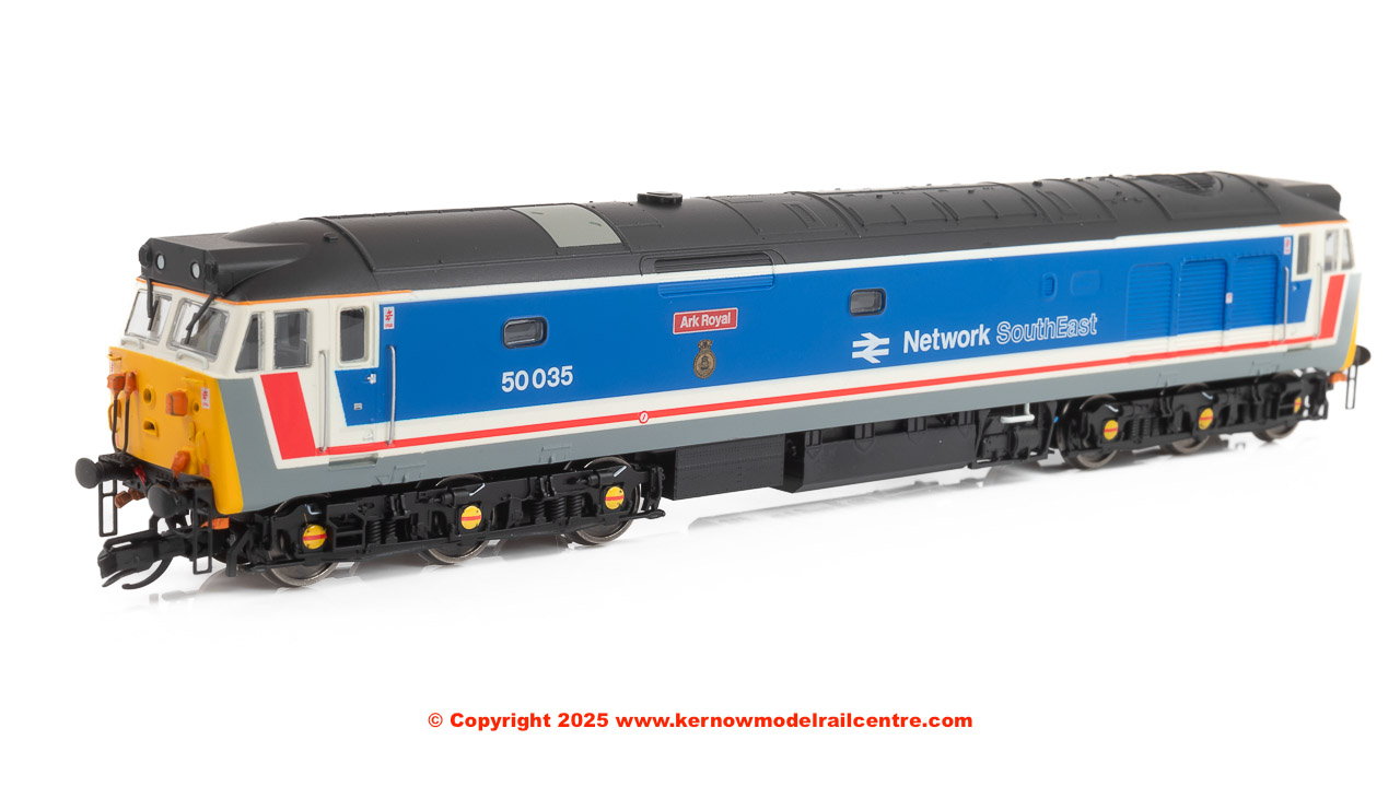 50035 ‘Ark Royal’ entered service on the August 1968. Built at the English Electric Vulcan Foundry and first allocated to Stoke devision under running number D435. This model represents 50035 in mid-1980’s condition in its classic NSE livery with Ark Royal nameplates.