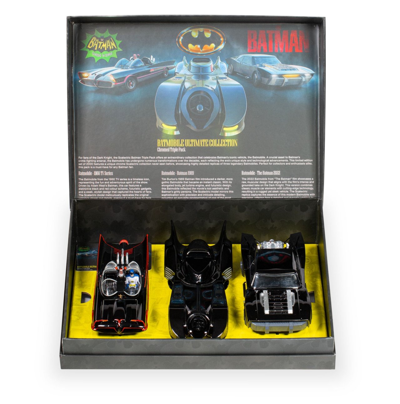 This is a limited edition set of only 2000 units. It features a unique chrome Scalextric collection never seen before, showcasing highly detailed replicas of three legendary Batmobiles.