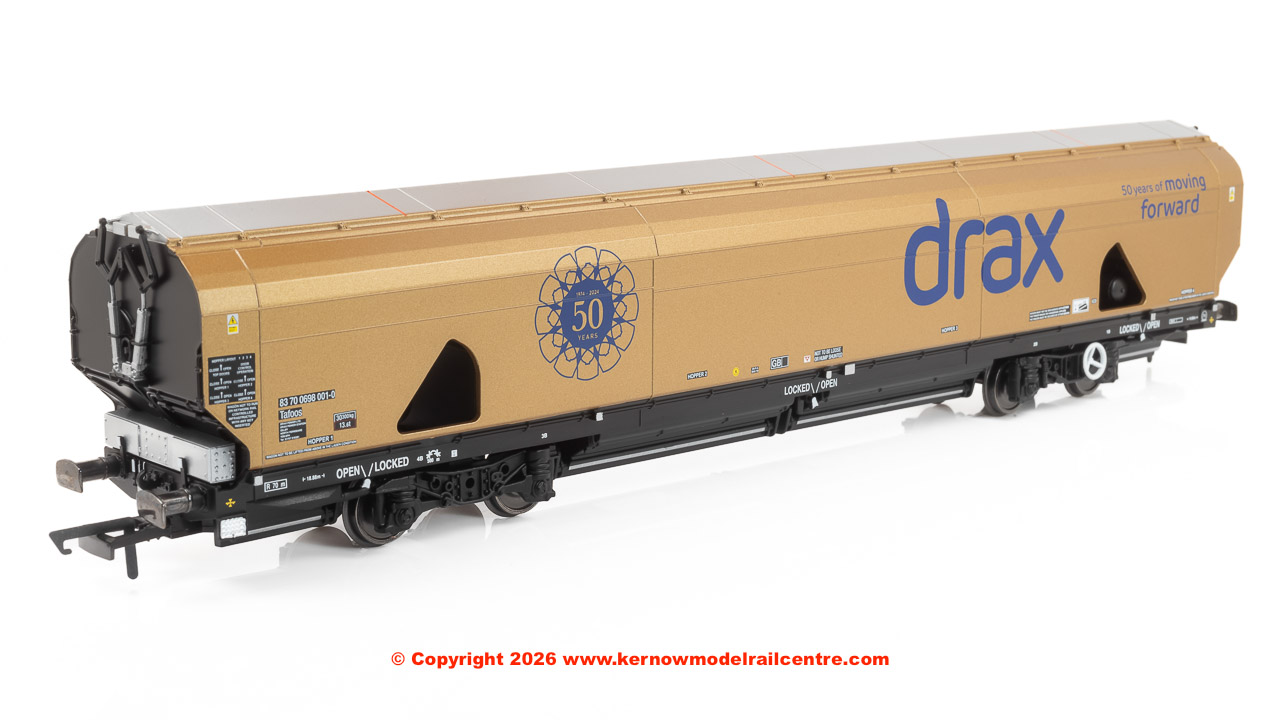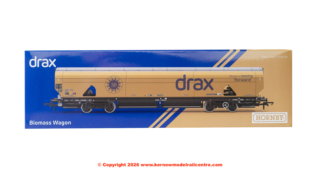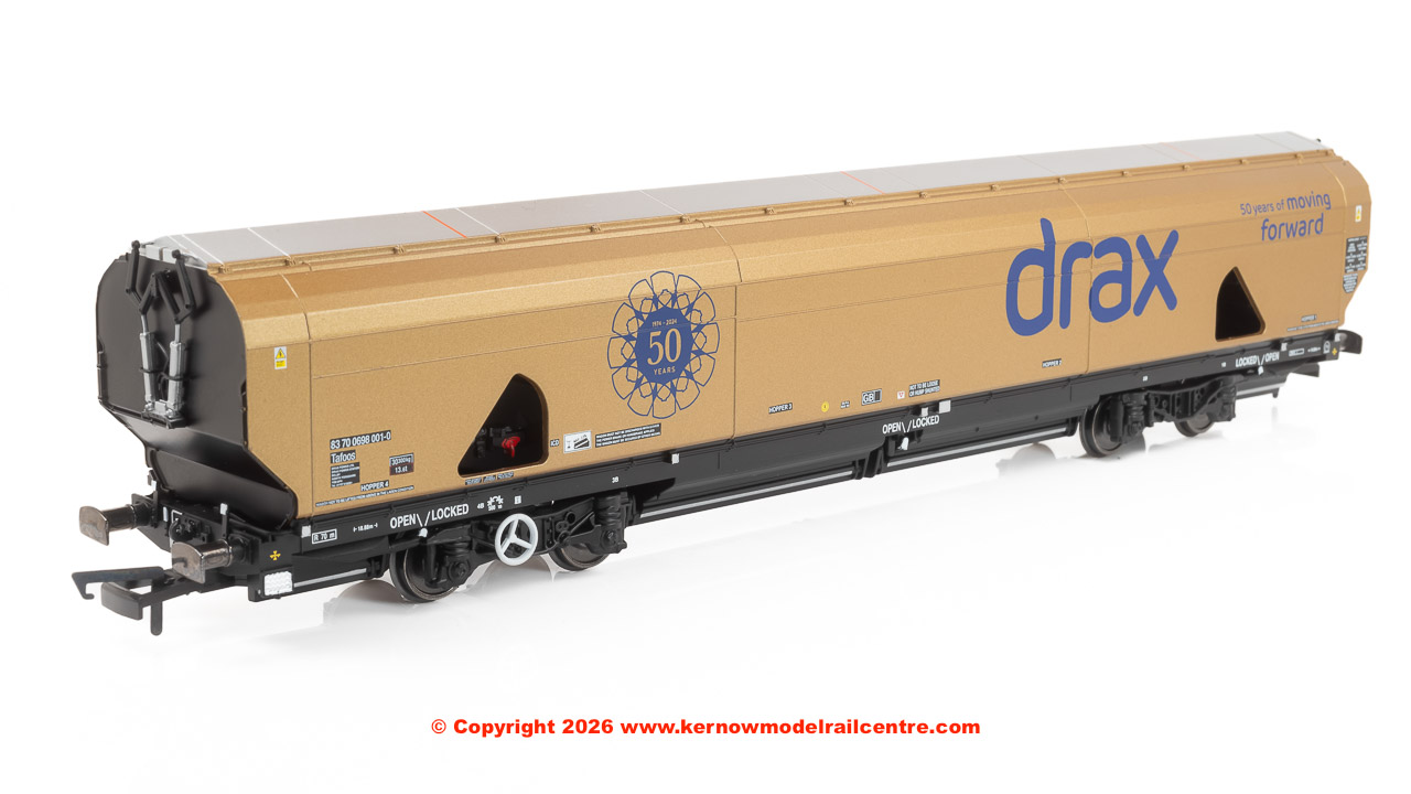 Finished in a striking gold livery, this model represents one of the eye-catching biomass wagons used to transport sustainable wood pellets to Drax, which has transformed from coal to biomass to support the nation’s journey to net zero. Featuring running number 83700698001-0, the wagon comes complete with an accessory pack.