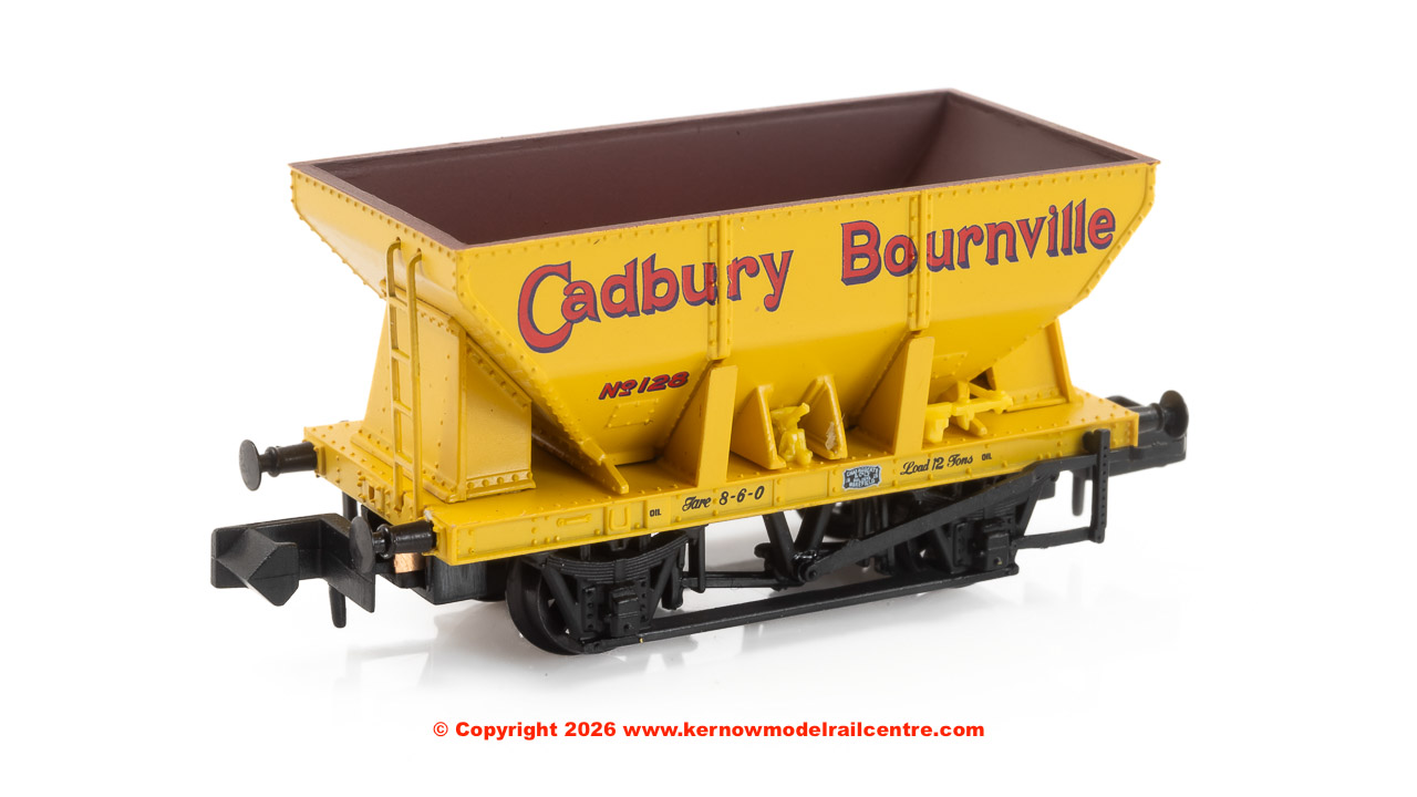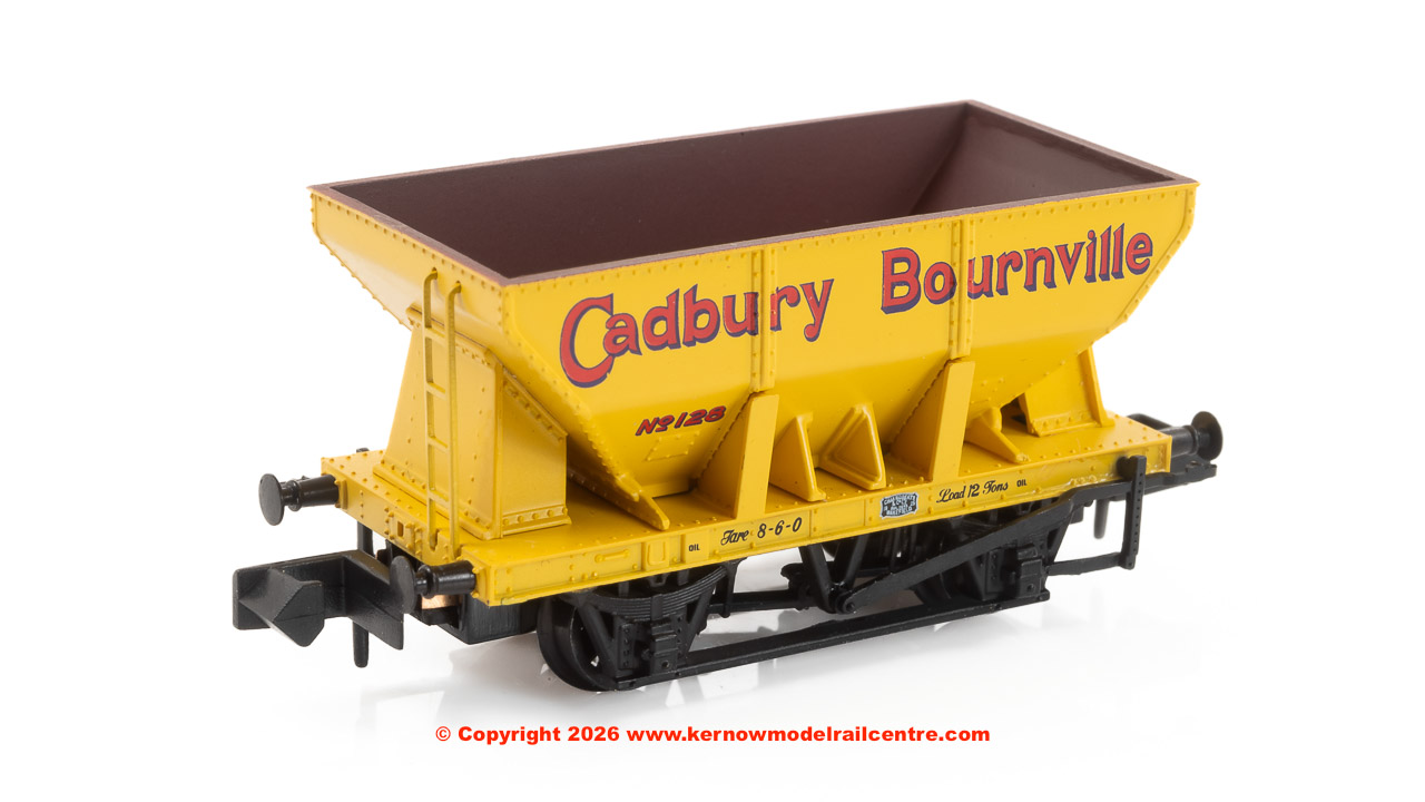 The 24T Iron Ore hopper was ordered by BR in 1950 and rather unusually, all 1500 to diagram 1/162 were constructed by outside contractors. The Graham Farish model faithfully replicates this historic wagon and is offered here in the vibrant yellow of the Cadbury Bournville company, which would have used these wagons to transport raw material to their factory.
