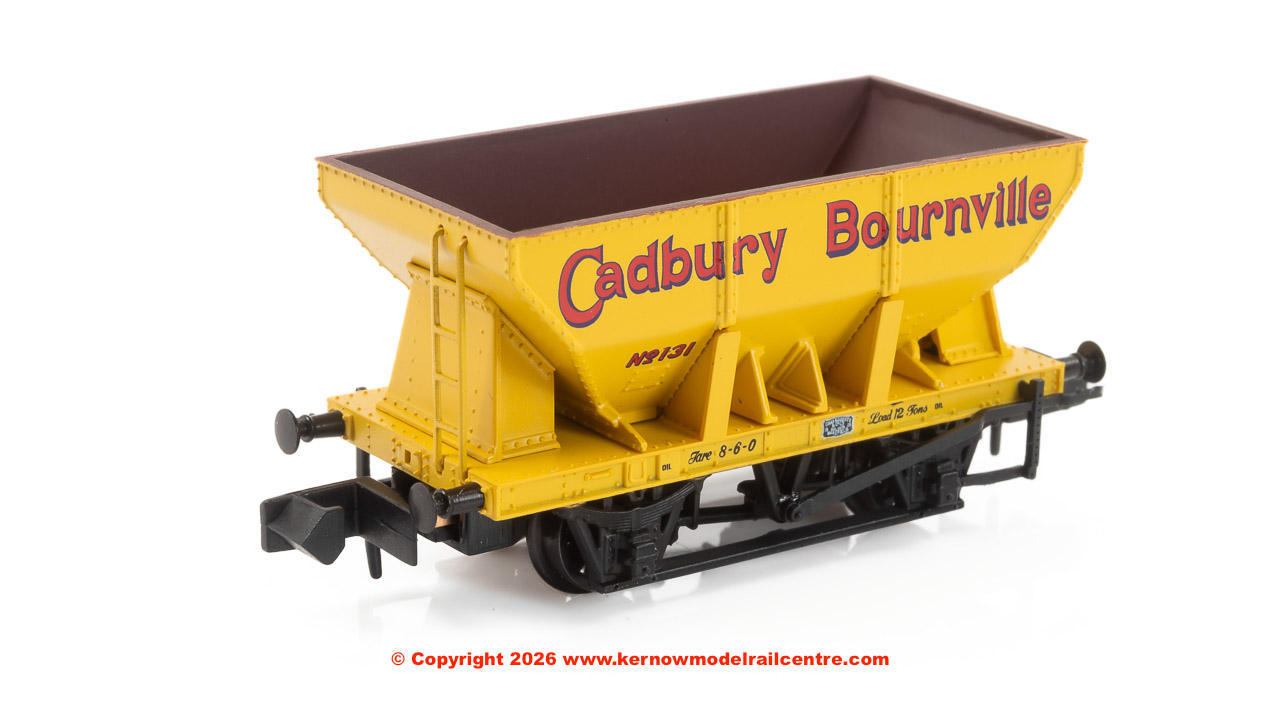 The 24T Iron Ore hopper was ordered by BR in 1950 and rather unusually, all 1500 to diagram 1/162 were constructed by outside contractors. The Graham Farish model faithfully replicates this historic wagon and is offered here in the vibrant yellow of the Cadbury Bournville company, which would have used these wagons to transport raw material to their factory.