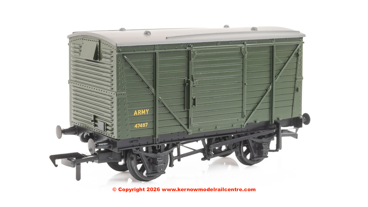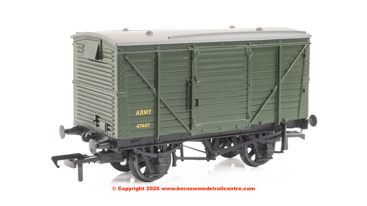 This model depicts a ventilated van but in use with the army in the latter half of the 20th century, which would’ve been used to transport army equipment. This Branchline model features an accurate bodyshell with fine plank engraving and further moulded detail. The chassis employs metal wheelsets of the 3-hole disc variety, whilst the brakes, brake handles and associated gear is all included. At either end metal buffer heads are fitted and the bufferbeam is completed with cosmetic coupling hooks. The simple but distinctive livery is applied using accurate colours and typefaces to produce a van fit for any OO scale model railway.