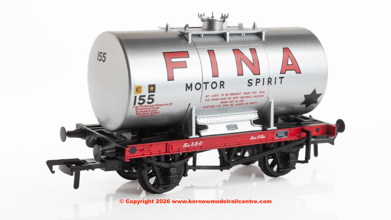 Early 14 Ton Tank Wagons with timber saddles, cradles and wire hawsers were built in response to the need for oil products to fuel Britain’s rapid development during the early-twentieth century, along with two world wars. As the hostilities of World War Two drew to a close, a new design of tank with a central anchor mechanism securing the tank to the chassis was agreed between the private operators, the Petroleum Board and the railway companies. Construction of this new wagon did not pick up pace until the early-1950s, and with the introduction of larger, vacuum braked tank wagons during the late-1950s, the Anchor-Mount design soon became obsolete, and the final wagons of this type were built in 1963. This model depicts a silver ‘Fina’ branded example, built in 1951 by Charles Roberts.