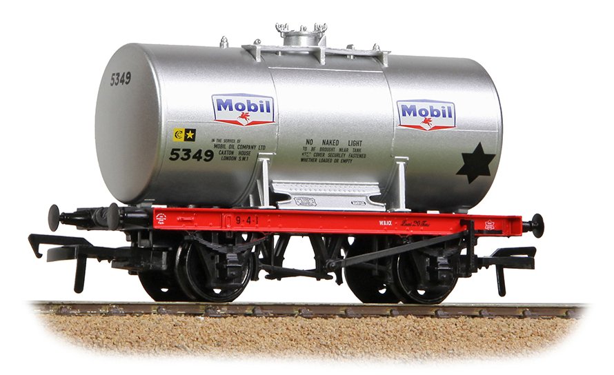 Early 14 Ton Tank Wagons with timber saddles, cradles and wire hawsers were built in response to the need for oil products to fuel Britain’s rapid development during the early-twentieth century, along with two world wars. As the hostilities of World War Two drew to a close, a new design of tank with a central anchor mechanism securing the tank to the chassis was agreed between the private operators, the Petroleum Board and the railway companies. Construction of this new wagon did not pick up pace until the early-1950s, and with the introduction of larger, vacuum braked tank wagons during the late-1950s, the Anchor-Mount design soon became obsolete, and the final wagons of this type were built in 1963. This model depicts a silver ‘Mobil’ branded example, built in 1949.