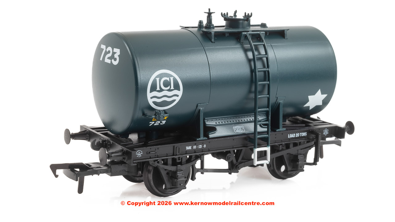 Early 14 Ton Tank Wagons with timber saddles, cradles and wire hawsers were built in response to the need for oil products to fuel Britain’s rapid development during the early-twentieth century, along with two world wars. As the hostilities of World War Two drew to a close, a new design of tank with a central anchor mechanism securing the tank to the chassis was agreed between the private operators, the Petroleum Board and the railway companies. Construction of this new wagon did not pick up pace until the early-1950s, and with the introduction of larger, vacuum braked tank wagons during the late-1950s, the Anchor-Mount design soon became obsolete, and the final wagons of this type were built in 1963. This model depicts a blue ‘ICI’ branded example, built in 1949.