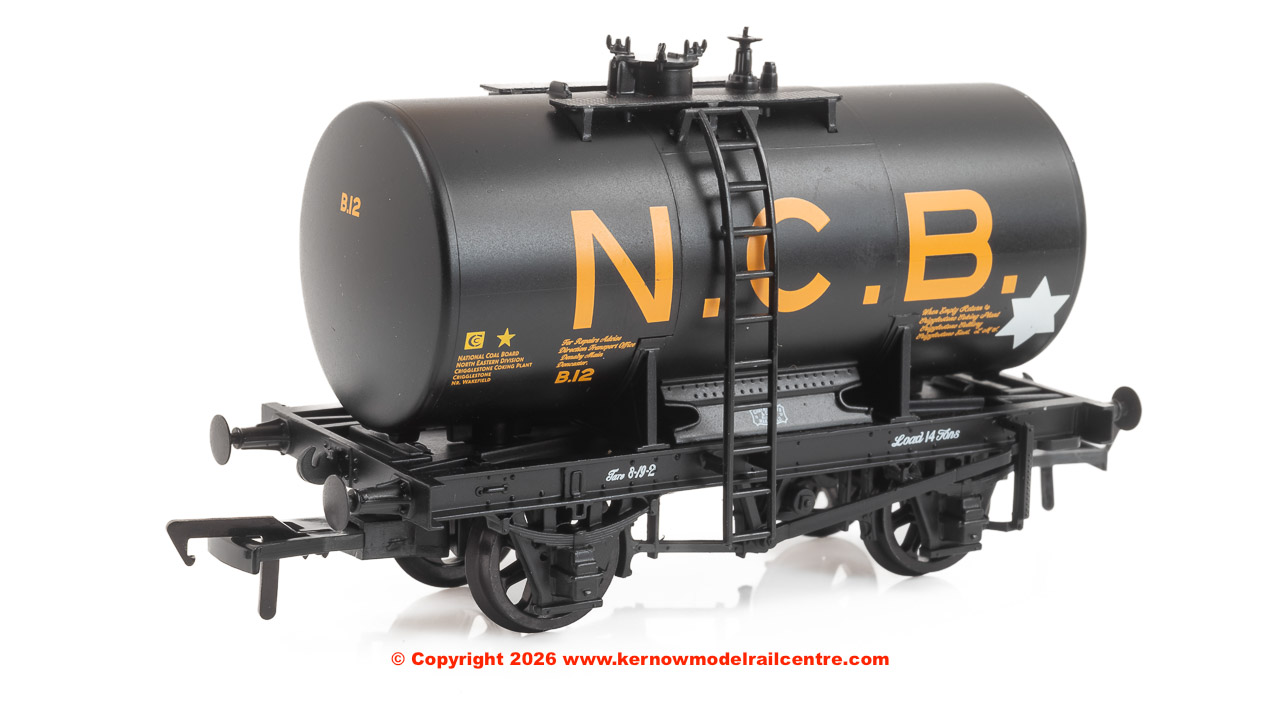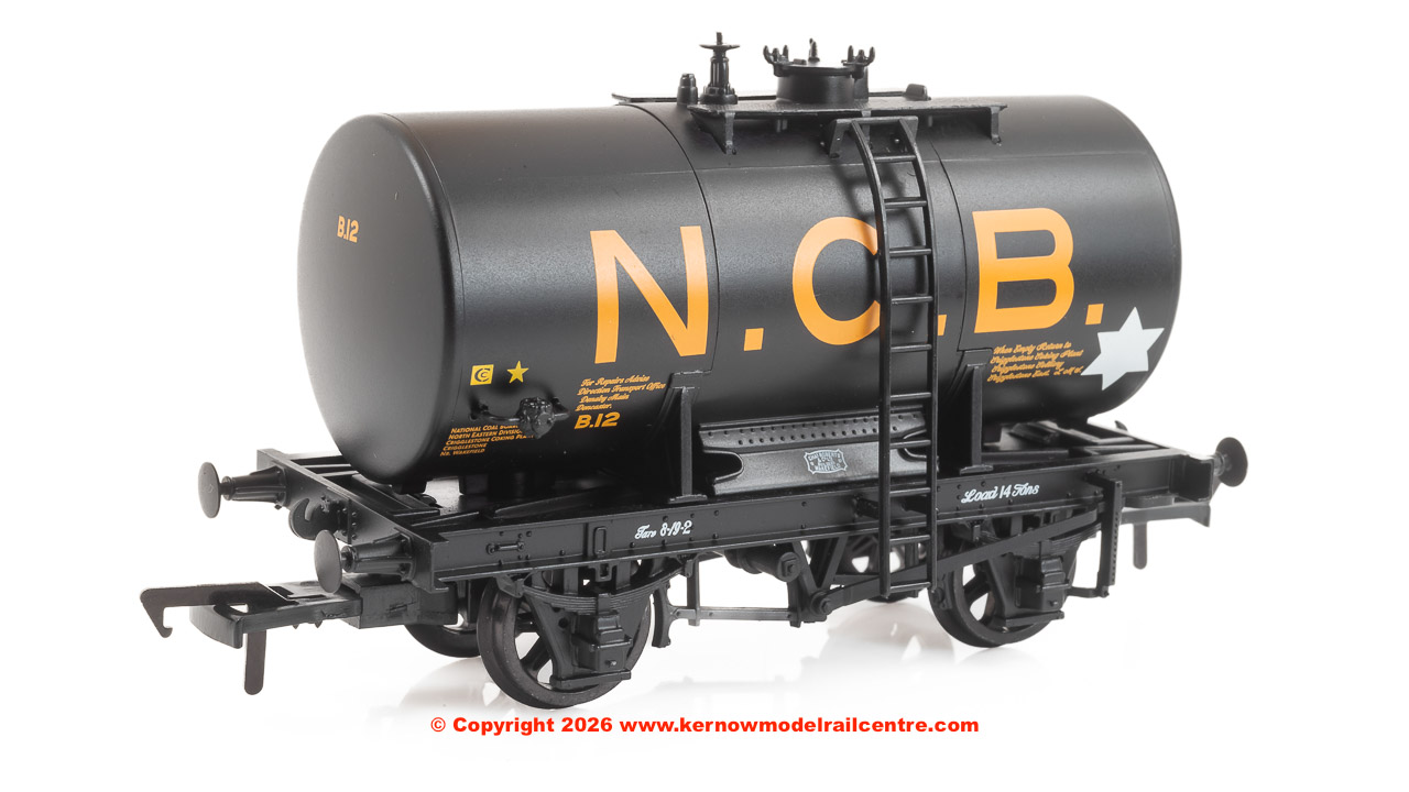 Early 14 Ton Tank Wagons with timber saddles, cradles and wire hawsers were built in response to the need for oil products to fuel Britain’s rapid development during the early-twentieth century, along with two world wars. As the hostilities of World War Two drew to a close, a new design of tank with a central anchor mechanism securing the tank to the chassis was agreed between the private operators, the Petroleum Board and the railway companies. Construction of this new wagon did not pick up pace until the early-1950s, and with the introduction of larger, vacuum braked tank wagons during the late-1950s, the Anchor-Mount design soon became obsolete, and the final wagons of this type were built in 1963. This model depicts a black ‘NCB’ branded example, built in the 1950s.