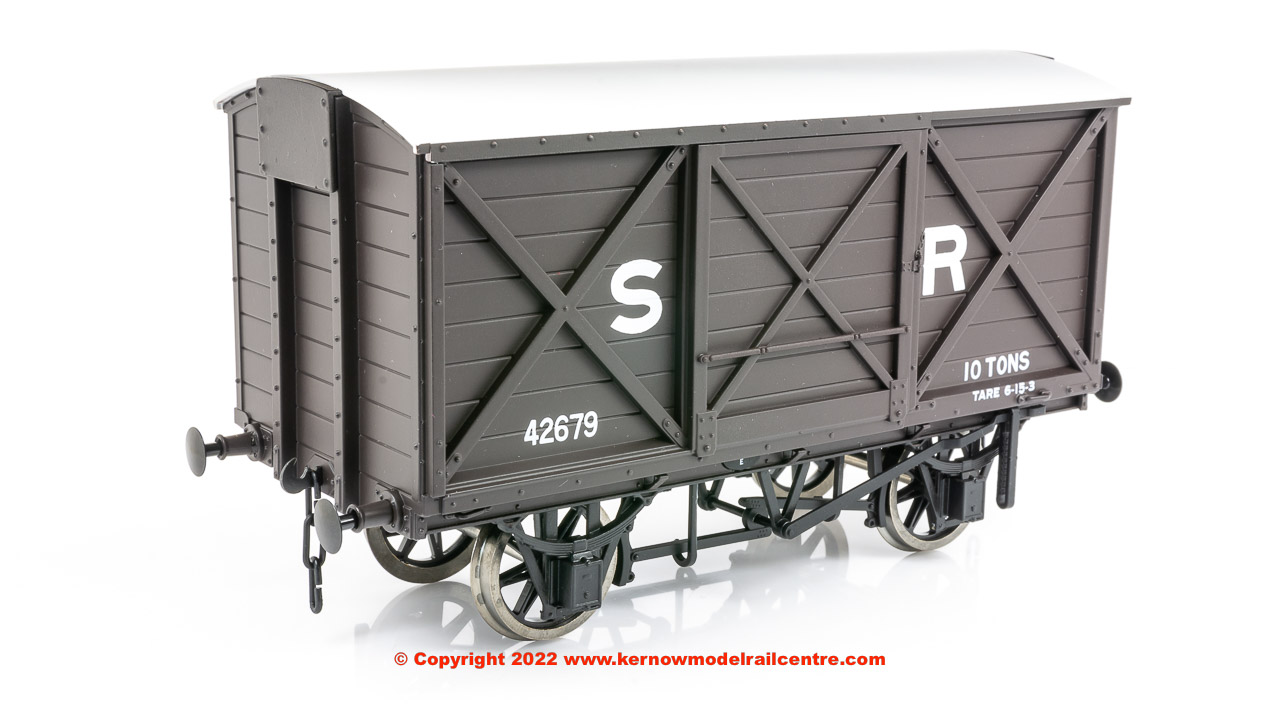 K7010E LSWR D1410 Covered Van with 8 1/2" end planking, Panter axleboxes, 8 open spoked wheels and SR freighter brakes in SR Brown pre 1936 livery number 42679